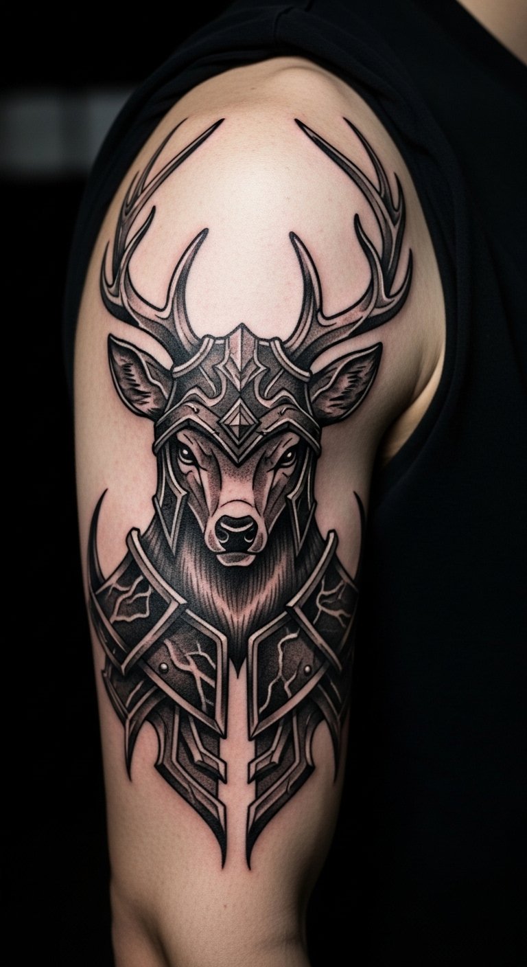 Thick lines armor a deer for a tough look. It fits those who want edge. Practice bold strokes with markers. Free videos guide warrior styles. Tape a print to your arm to check. Upper arms show strength clear. Find group sessions for lower costs. About $160 total. Care with items like bandages you have.