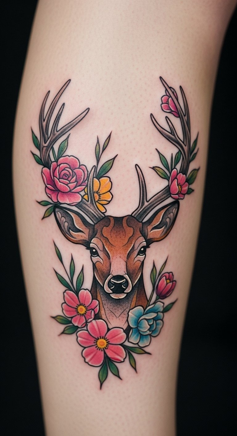 Flowers bloom around a deer on your leg. It adds soft nature vibes. Draw petals with crayons at home. Online sites offer free floral templates. Stick one on to preview placement. Legs let you cover or show as needed. Email artists for package deals. Expect $140. Use lotions from your cabinet for healing.