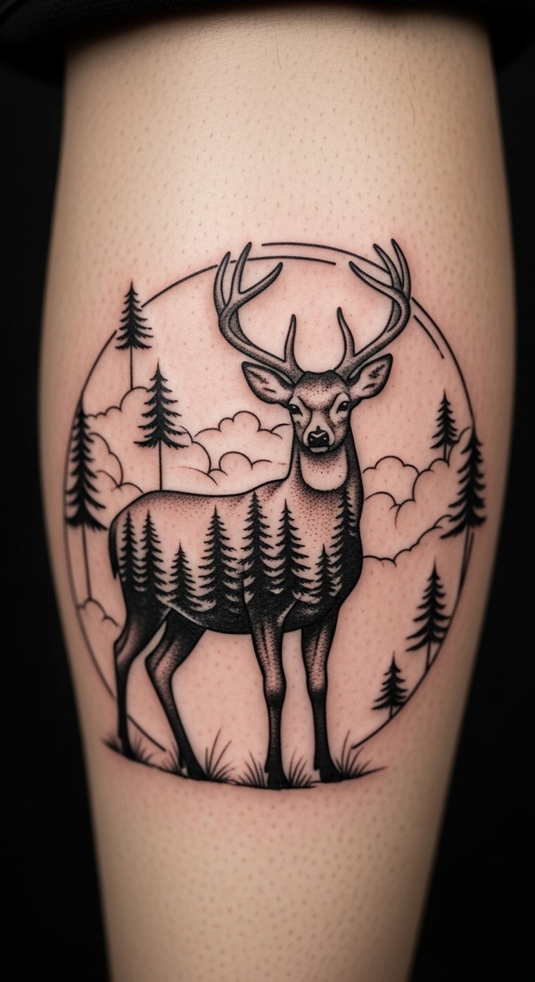 Trees frame a deer like a living forest. It brings outdoors to you. Draw tree shapes with sticks and paper. Free resources provide nature mixes. Hold up a design on your calf to fit. Calves balance art and utility. Get estimates from local pros. About $110. Care using natural elements like tea.