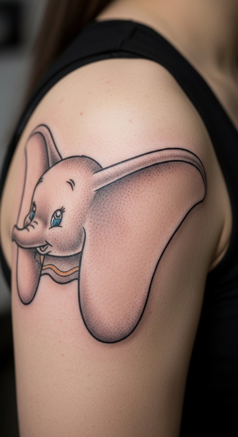 Dumbo ears on your shoulder bring whimsy. Trace them on paper first. Quick and free. Cost $90. Use shading wisely. Personalize with feathers. Shoulders heal easy. Cover initially. Apps help place. Keep it fun.