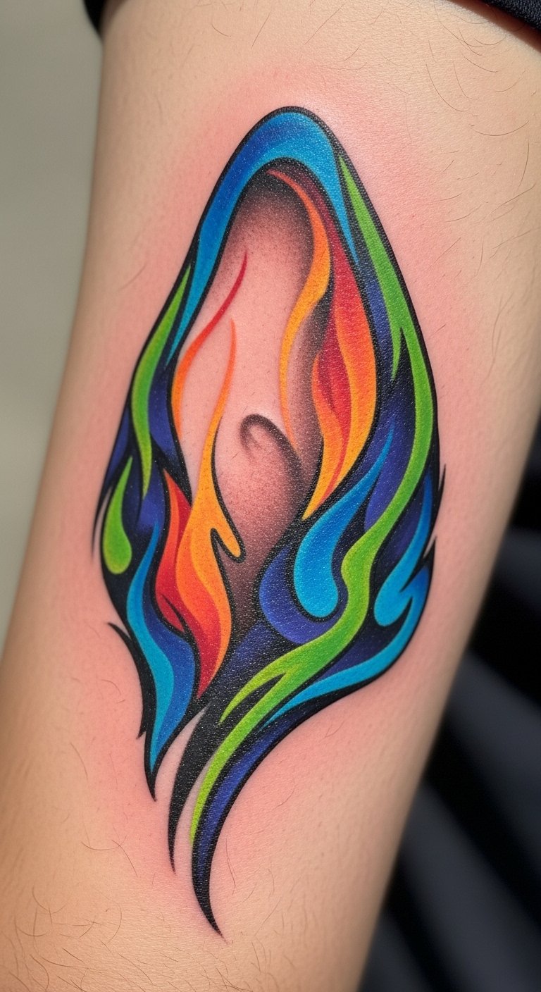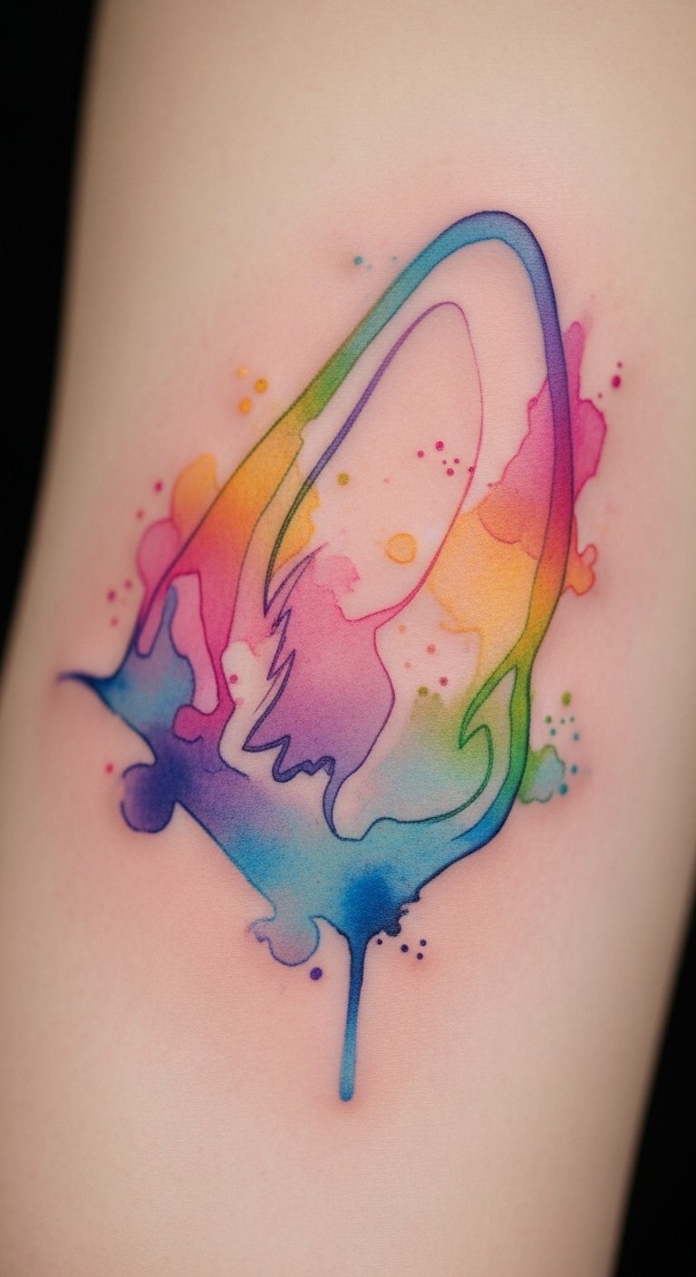 A colorful abstract dog ear tattoo plays with hues and forms. Start with swirls on a sketch pad. Mix colors from your craft box. Use apps for ideas. Test with face paints. Place on your arm. DIY: blend paints at home. Keep it lively. This adds personality easily.