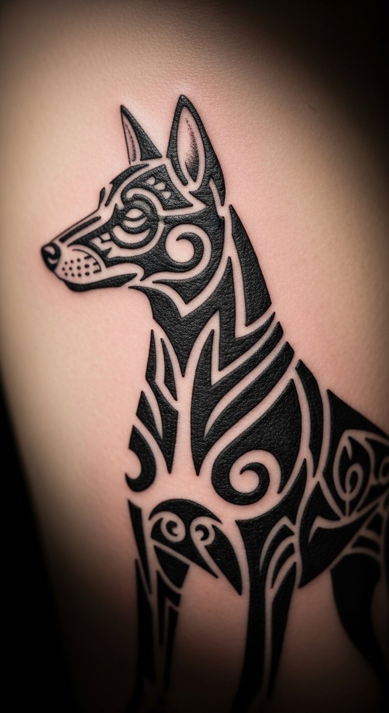 A shaded tribal dog motif tattoo uses patterns for depth. Draw tribal lines. Shade with pencils. Get free designs. Try with charcoal. Place on arm. Home idea: carve stamps. Keep shadows bold.
