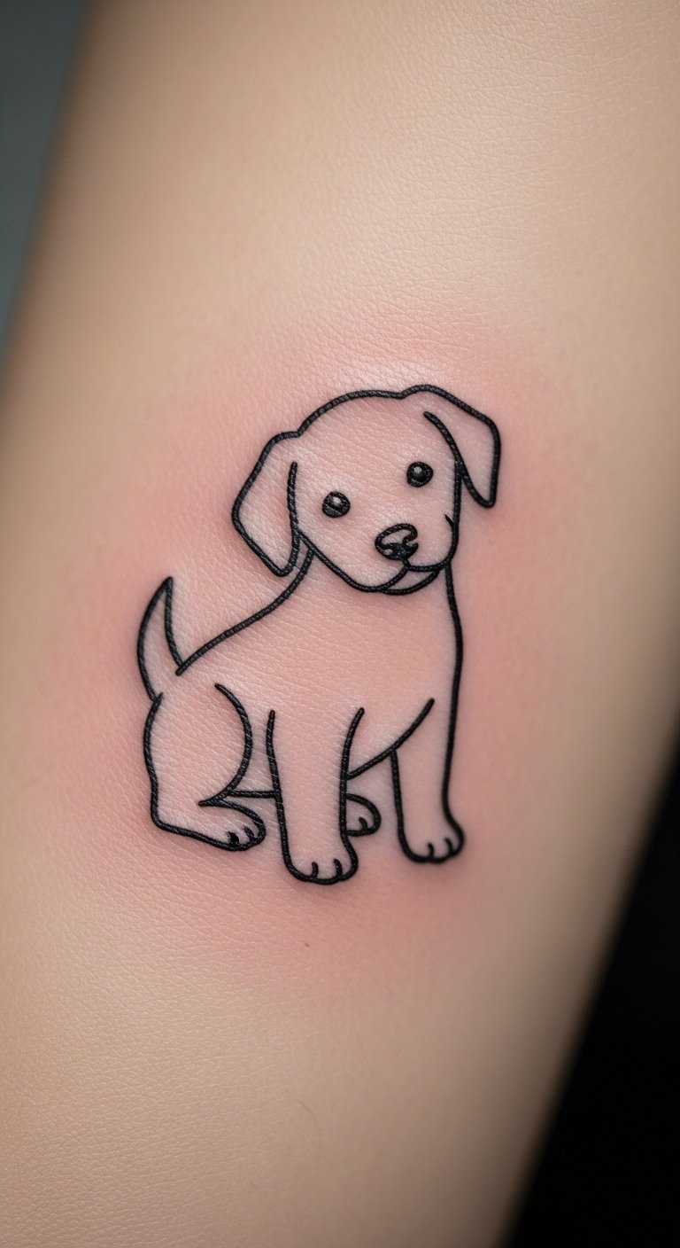 A playful puppy outline tattoo shows youth. Trace a pup shape. Add ears. Use apps. Test with stickers. Put on ankle. DIY: cut shapes. Keep it fun.