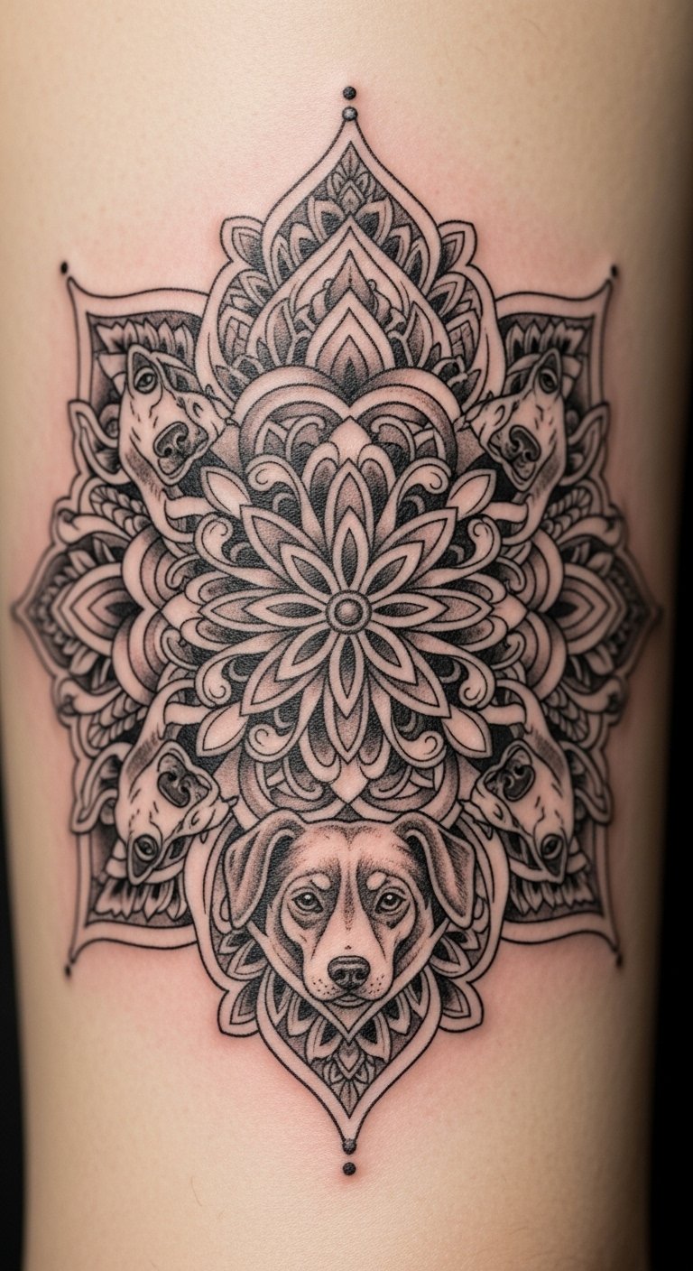 An intricate mandala with dog tattoo blends circles and pets. Build symmetry. Use rulers. Find free mandalas. Try with string art. Site on back. Home tip: draw circles. Keep it detailed.