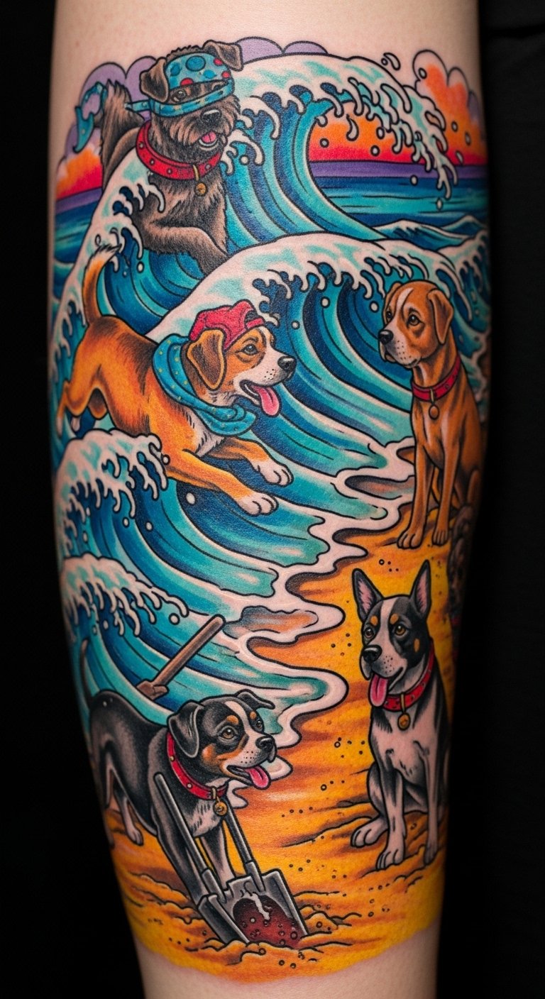 A sunny beach dog scene tattoo evokes vacations. Sketch sand and dogs. Add waves. Get beach images. Test with sand art. Place on shoulder. DIY: use sand drawings. Keep it relaxing.