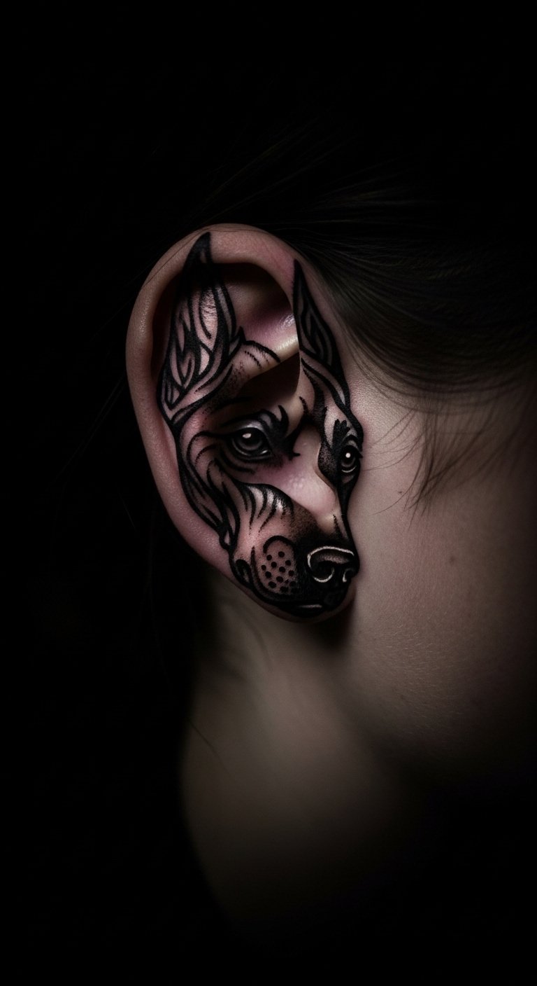 A gothic dark dog ear tattoo adds mystery. Draw dark shapes. Shade heavily. Use free gothic art. Try with ink washes. Put on chest. Home idea: blend shadows. Keep it moody.