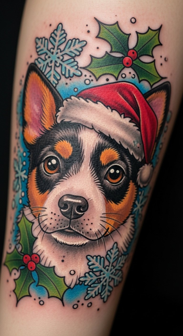 A festive holiday pet design tattoo celebrates seasons. Add bells to pets. Use holiday colors. Find free clips. Test with ribbons. Site on arm. DIY: decorate cards. Keep it merry.