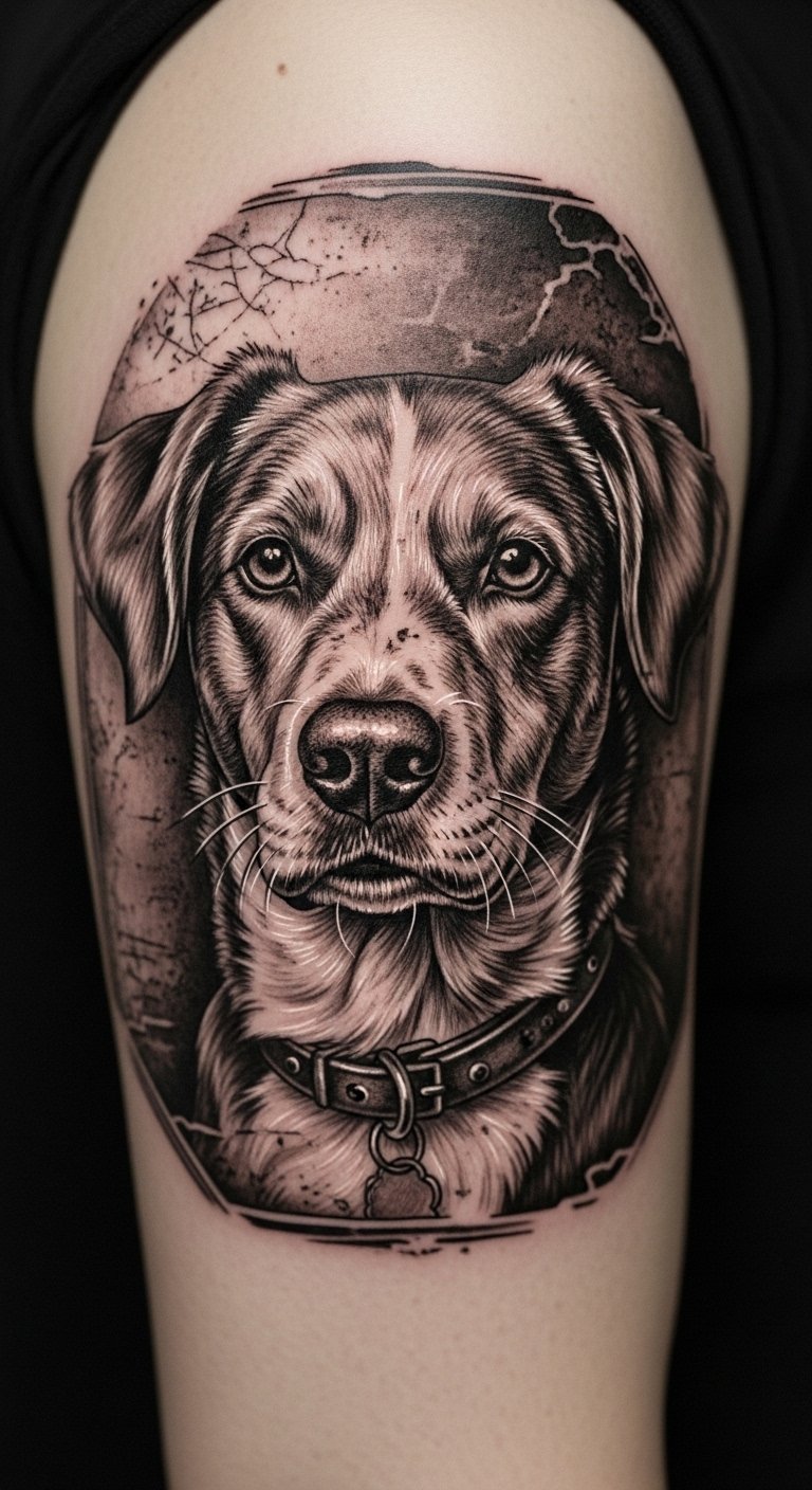A retro vintage dog portrait tattoo nods to the past. Sketch old photos. Use sepia shades. Get free filters. Try with tea stains. Place on leg. Home tip: age paper. Keep it nostalgic.