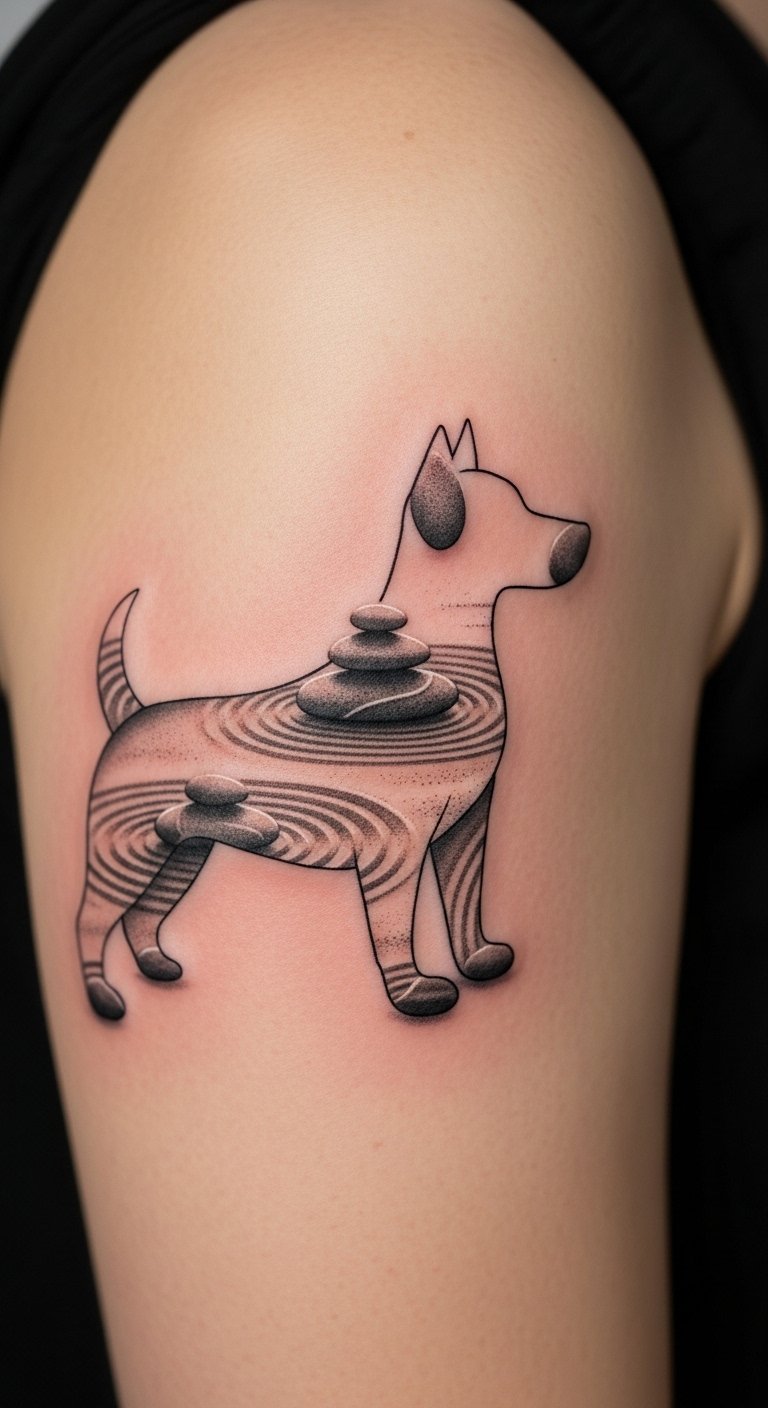 A zen garden dog motif tattoo promotes peace. Draw rocks and dogs. Use simple strokes. Get free zen art. Try with sand. Site on back. Home idea: rake sand. Keep it serene.