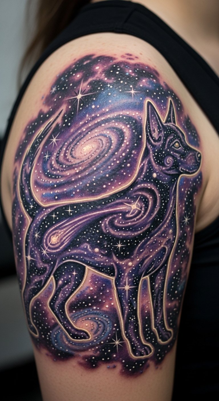 A cosmic starry dog design tattoo reaches for the stars. Add constellations to pets. Use dot techniques. Find free space art. Try with glow sticks. Put on shoulder. Home tip: stargaze first. Keep it dreamy.