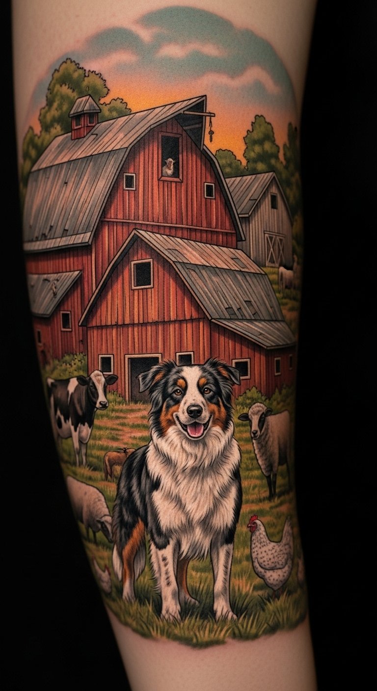 A rustic farm dog scene tattoo recalls country life. Sketch barns and dogs. Use brown shades. Get free farm images. Test with clay. Site on leg. DIY: mold shapes. Keep it grounded.