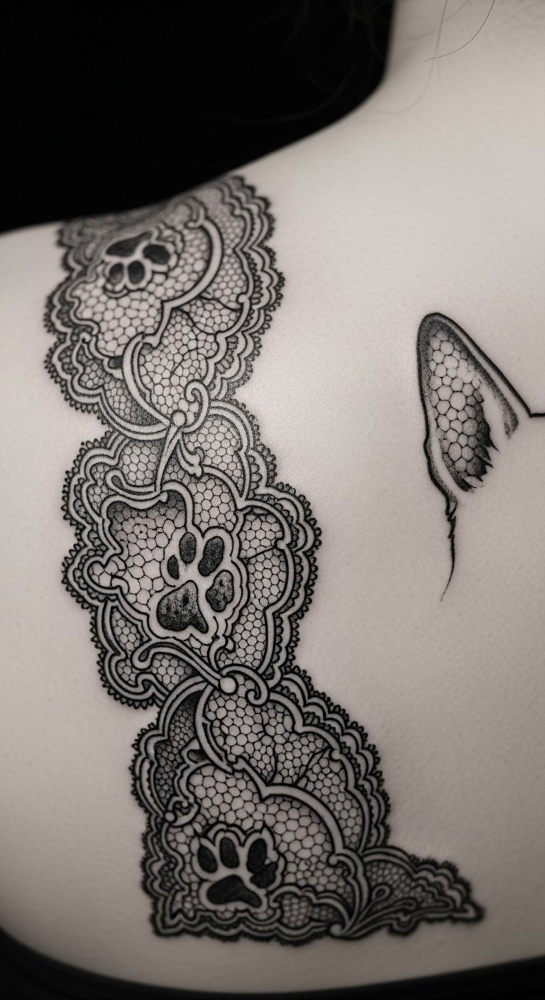 An elegant lace dog border tattoo frames with delicacy. Draw lace around dogs. Use fine lines. Find free lace designs. Try with fabric. Place on wrist. Home idea: sew samples. Keep it refined.