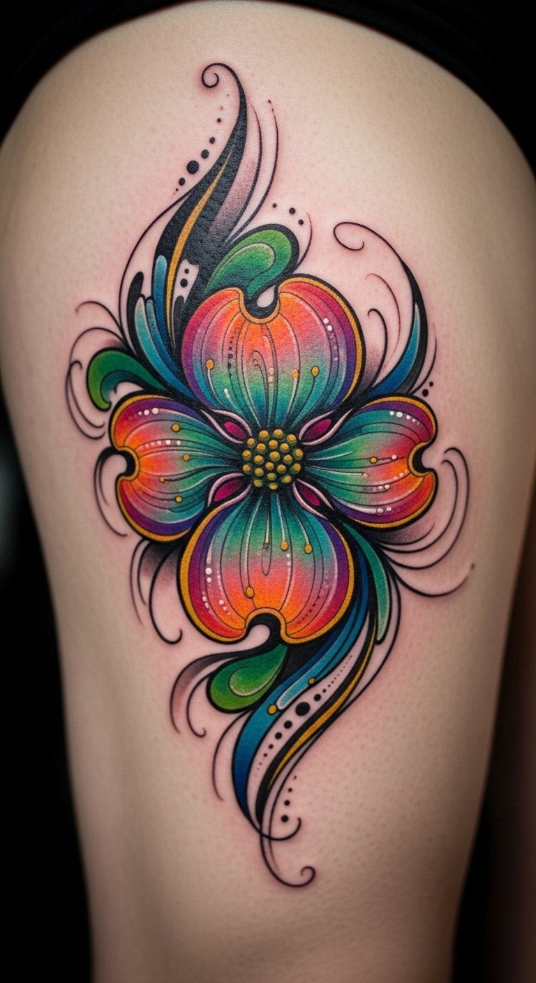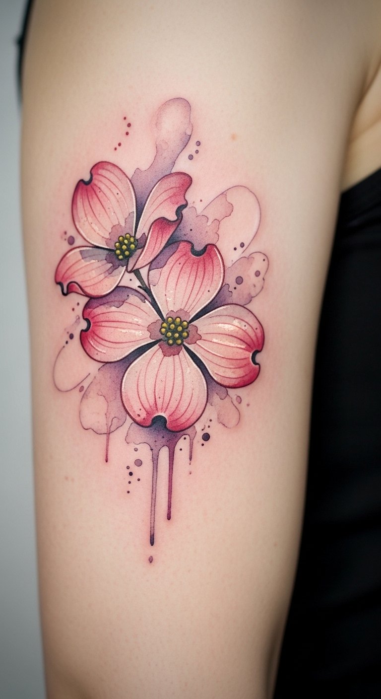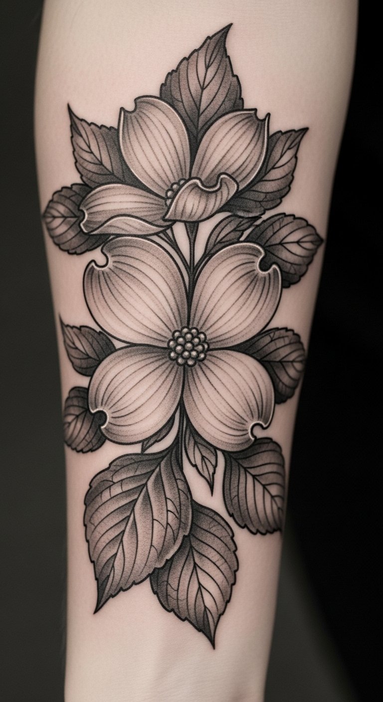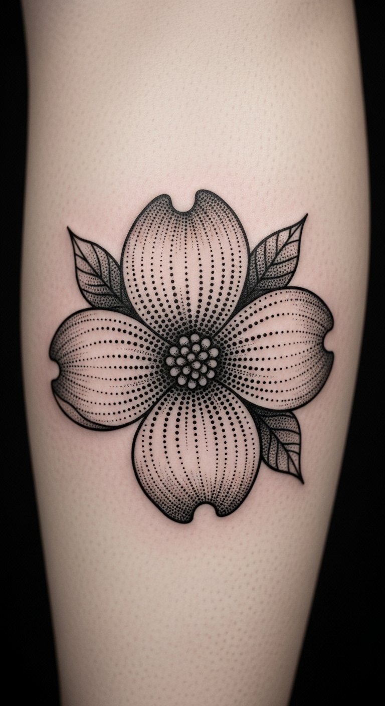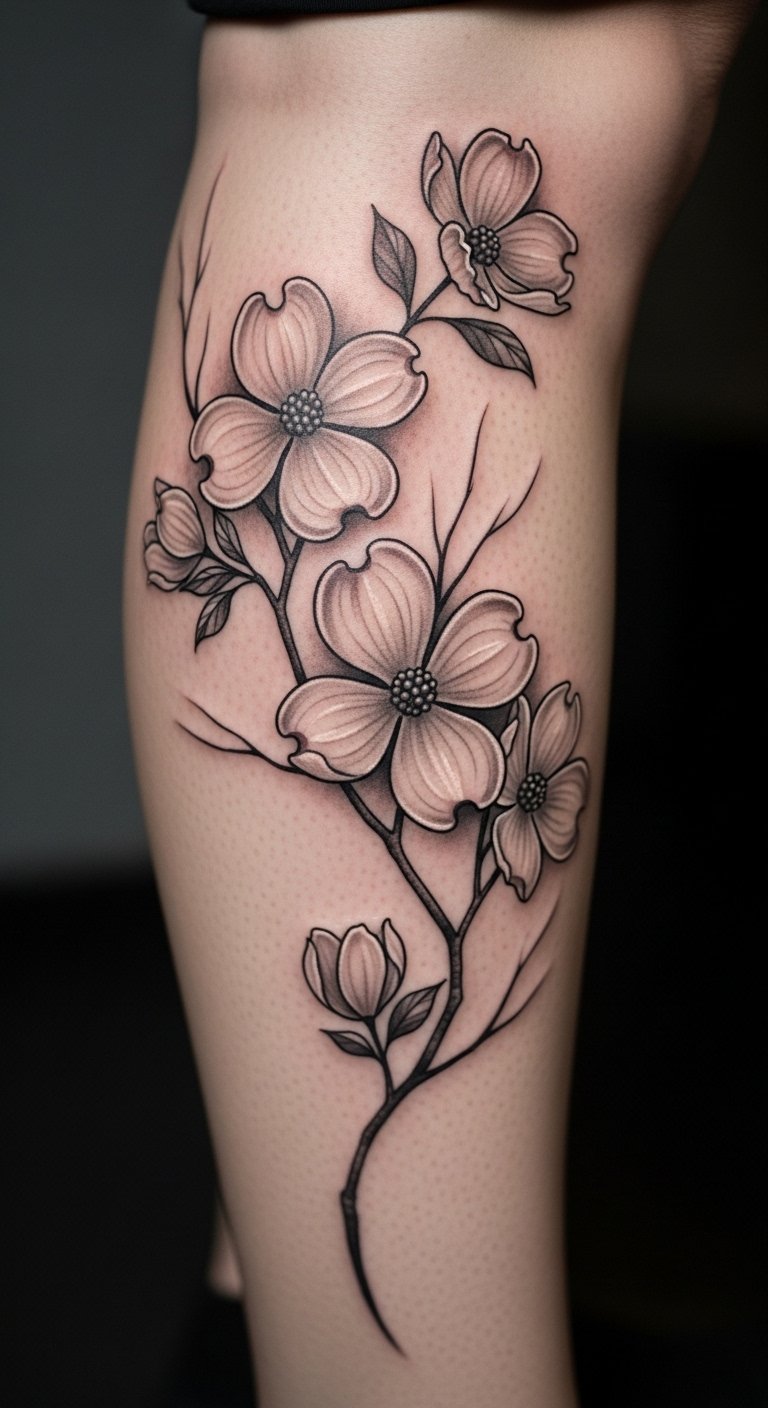 Twist the dogwood into abstract swirls for a unique look. It plays with shapes and flow. Go for a custom but cheap version—under $70. Experiment with swirls using string art at home. Watch free abstract tutorials online. Position it on your leg for fun. Check group tattoo sessions for discounts. Maintain with gentle washes. This style sparks imagination.