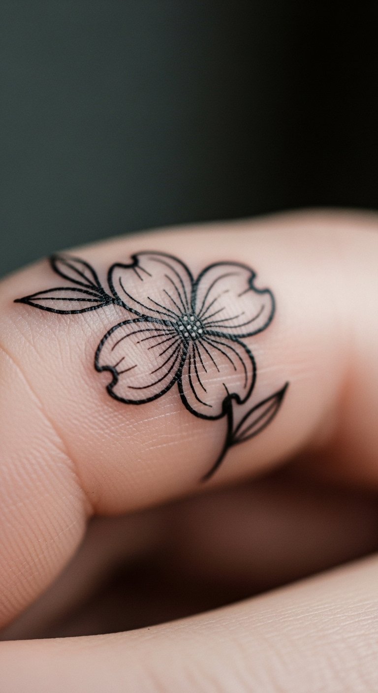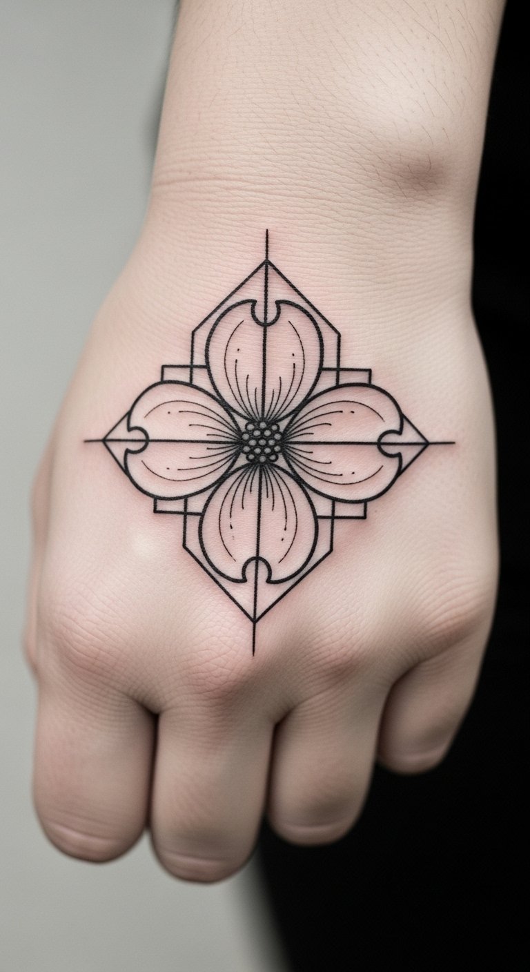 Mix shapes and petals in this geometric twist. It turns the dogwood into a modern abstract. Opt for black ink only to lower costs—basic sessions start at $40. Experiment with geometric stencils using paper and a ruler at home. Watch quick online videos for pattern ideas. Put it on your finger for a discreet option. Check for walk-in deals at local studios. Clean it with soap from your bathroom. This style fits anyone into simple art.