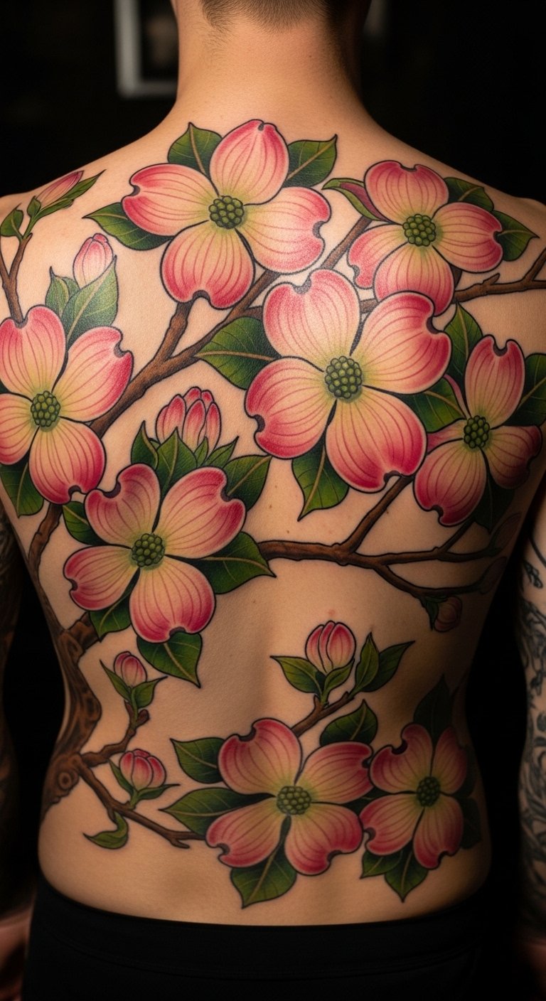 Go big on your back with a sprawling dogwood scene. It covers more space for impact. Break costs by getting it in stages—start at $100. Sketch large ideas on big paper with crayons. Follow step-by-step videos for layout. Place it where you can see it in mirrors. Ask about payment plans at shops. Use scarves to protect it. This design turns your back into a story.