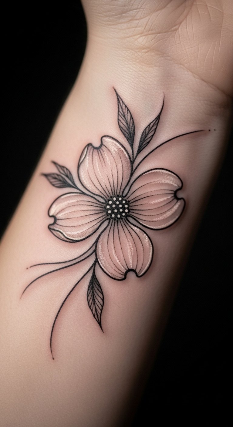 This design keeps things simple with a clean black outline of a dogwood flower. It’s ideal for beginners or those wanting subtle ink. Start with a small size to save money—tattoos under 2 inches often cost less than $50. Sketch your own version on paper using a basic pen and free online templates. Add personal twists, like adding a tiny leaf. Pick a local artist who offers flash deals for budget options. This style heals fast and looks great on the wrist. Try practicing with henna first to test the look. Keep maintenance easy with daily moisturizer.