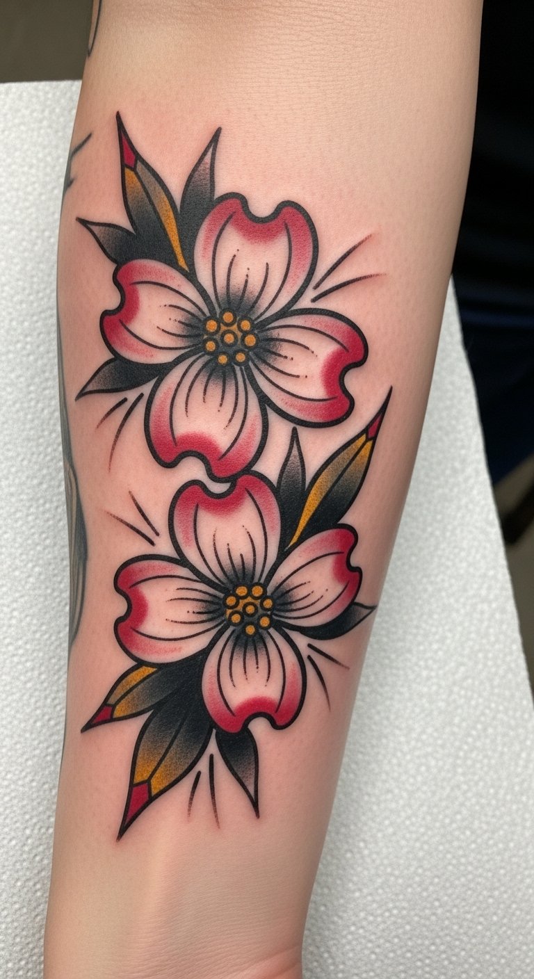 Go bold with bright colors on this dogwood design. It brings the flower to life with reds, whites, and greens. Choose affordable ink sessions by opting for smaller areas like the arm. Draw inspiration from phone apps that let you color in designs for free. Mix in your favorite shades using colored pencils at home. This tattoo pops in summer light and suits outdoor types. Look for artists with package deals to cut costs. Heal it quickly with aloe vera from your kitchen. Wear it proudly as a daily reminder of growth.
