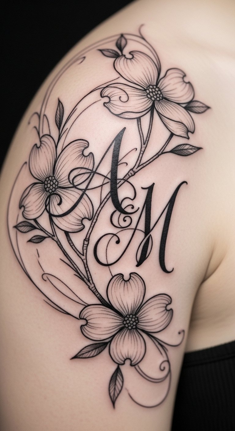 Add your initials to the dogwood for a personal note. It makes it uniquely yours. Opt for added text at $60. Write initials with markers first. Use free personalization apps. Put it on your shoulder for meaning. Seek custom add-on deals. Heal with home remedies. This design tells your story.