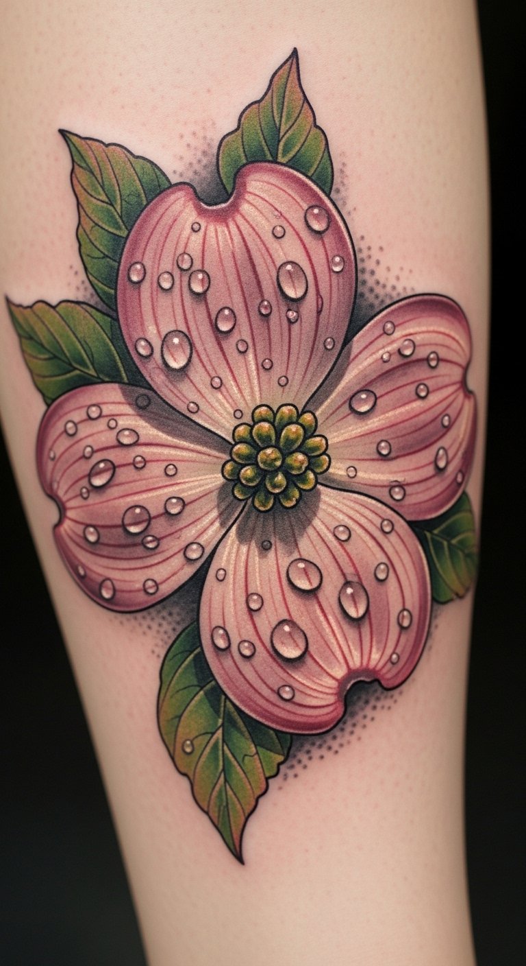 Add water drops to your dogwood for freshness. It makes it look dewy. Go for details under $60. Drip water on sketches. Find drop ideas free. Put it on your leg for reality. Look for detail add-ons. Use water-based care. This design feels alive.