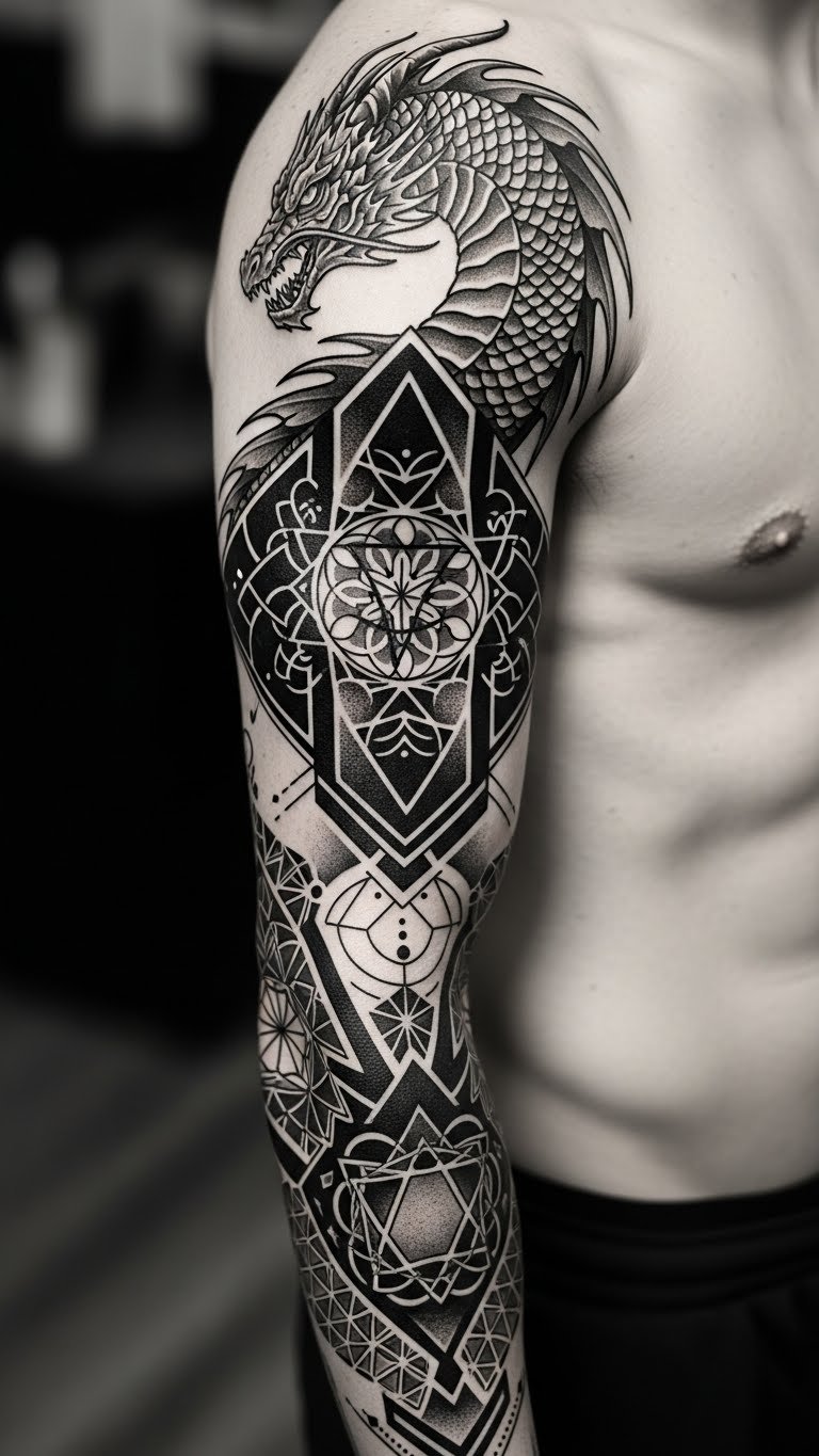 Imagine bold black lines forming a dragon that covers your arm. This look is edgy and clean, ideal for everyday wear. Sketch ideas on paper first. Try a temporary tattoo sticker for $5 to test it. Budget ink? Find artists charging $200–400. Customize by adding dots or shapes. Keep the process to two visits; use bandages for healing. This tattoo means strength. Put it on your sleeve for style. Quick tips: compare prices online, book ahead, and bring references. It makes a statement without fuss.