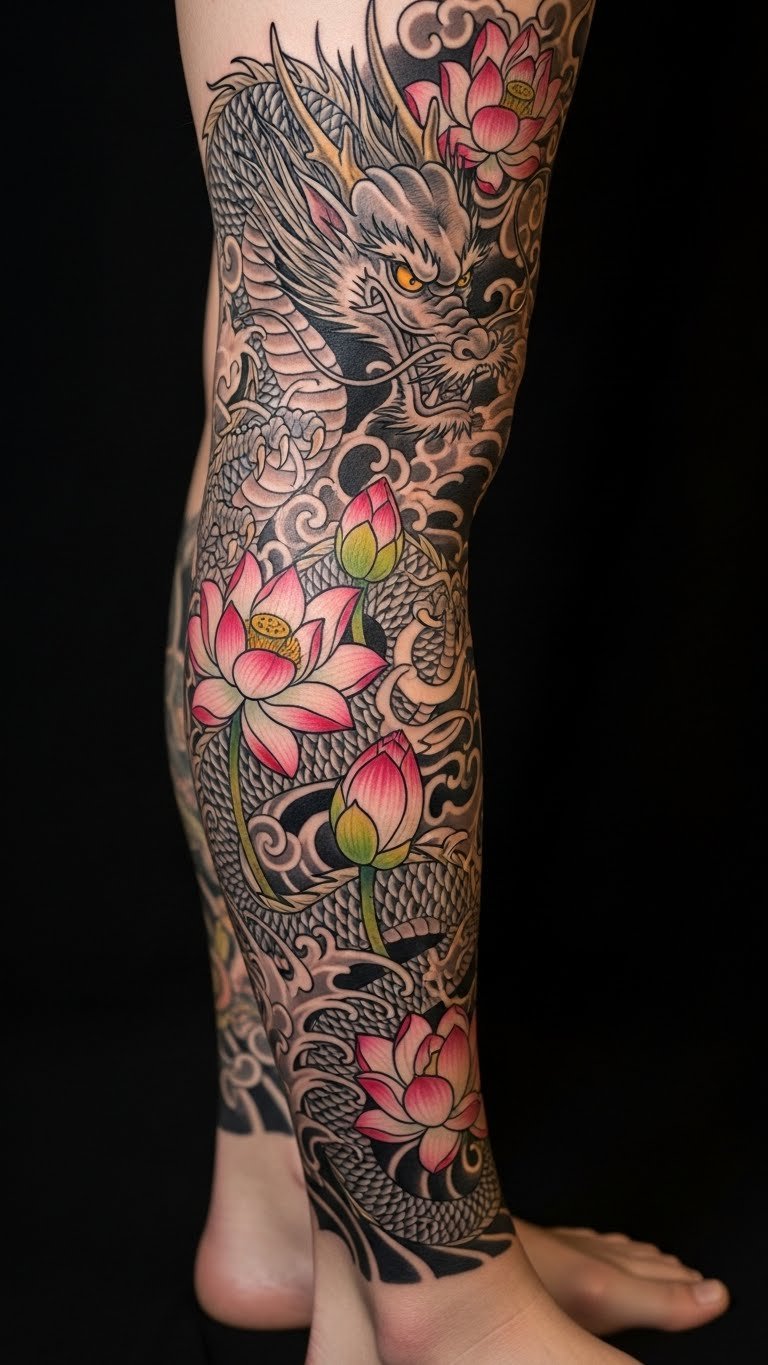 See a dragon with lotus flowers, blending growth and power. This mix is beautiful. Trace lotus petals. Try flower tattoos temporarily. Cost: $200–400. Personalize blooms. One visit; care gently. It means renewal. Leg for flow. Tips: combine ideas, find matches, and enjoy. This tattoo blooms with meaning.