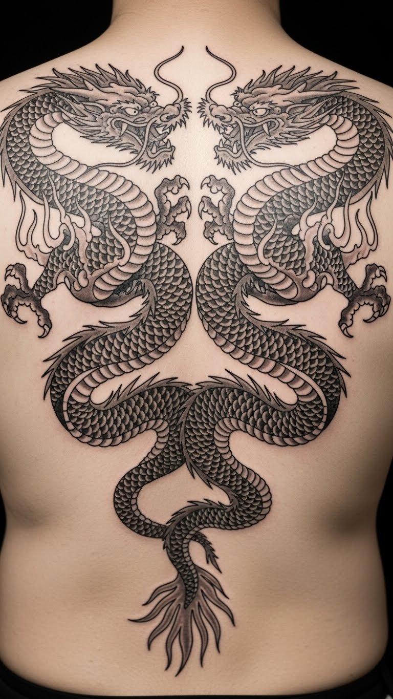 Imagine two dragons facing off, for perfect balance. This design speaks symmetry. Draw pairs. Practice with dual stickers. Price: $300–600. Customize positions. Two sessions; protect area. It means harmony. Back for balance. Actions: plan symmetry, talk to pros, and balance life. This tattoo harmonizes.