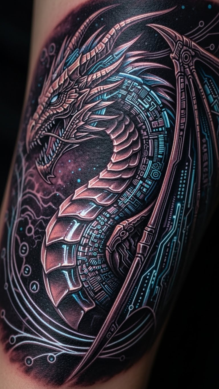 Think of a modern dragon with cyber edges, for tech lovers. This style is fresh. Design digitally. Try digital art apps for free. Tattoo: $250–450. Add circuits. One session; keep clean. It means innovation. Arm for show. Steps: explore tech, discuss with artists, and adapt. This choice modernizes.