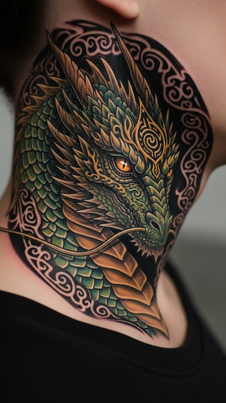 See a wise dragon on your neck, full of knowledge. This design shares insight. Trace eyes. Use necklaces for tests. Cost: $150–350. Customize symbols. One visit; cover if needed. It means wisdom. Neck for prominence. Tips: reflect on it, choose artists, and learn. This tattoo enlightens.