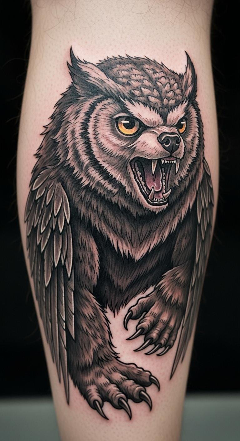 Owlbears mix fun and fear. Get a basic version on your leg for $80. Draw it freehand on paper first. Add feathers for a unique twist. Find affordable templates online. Place it on areas that flex for movement. Stick to simple lines to cut costs. DIY with washable markers on your skin. Tie it to your character’s backstory. This design is versatile and bold. Use cream for easy care. Experiment with friends using phone apps.