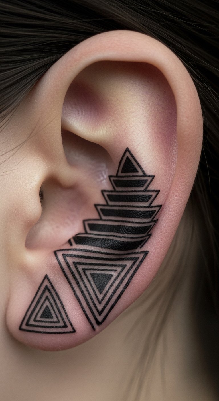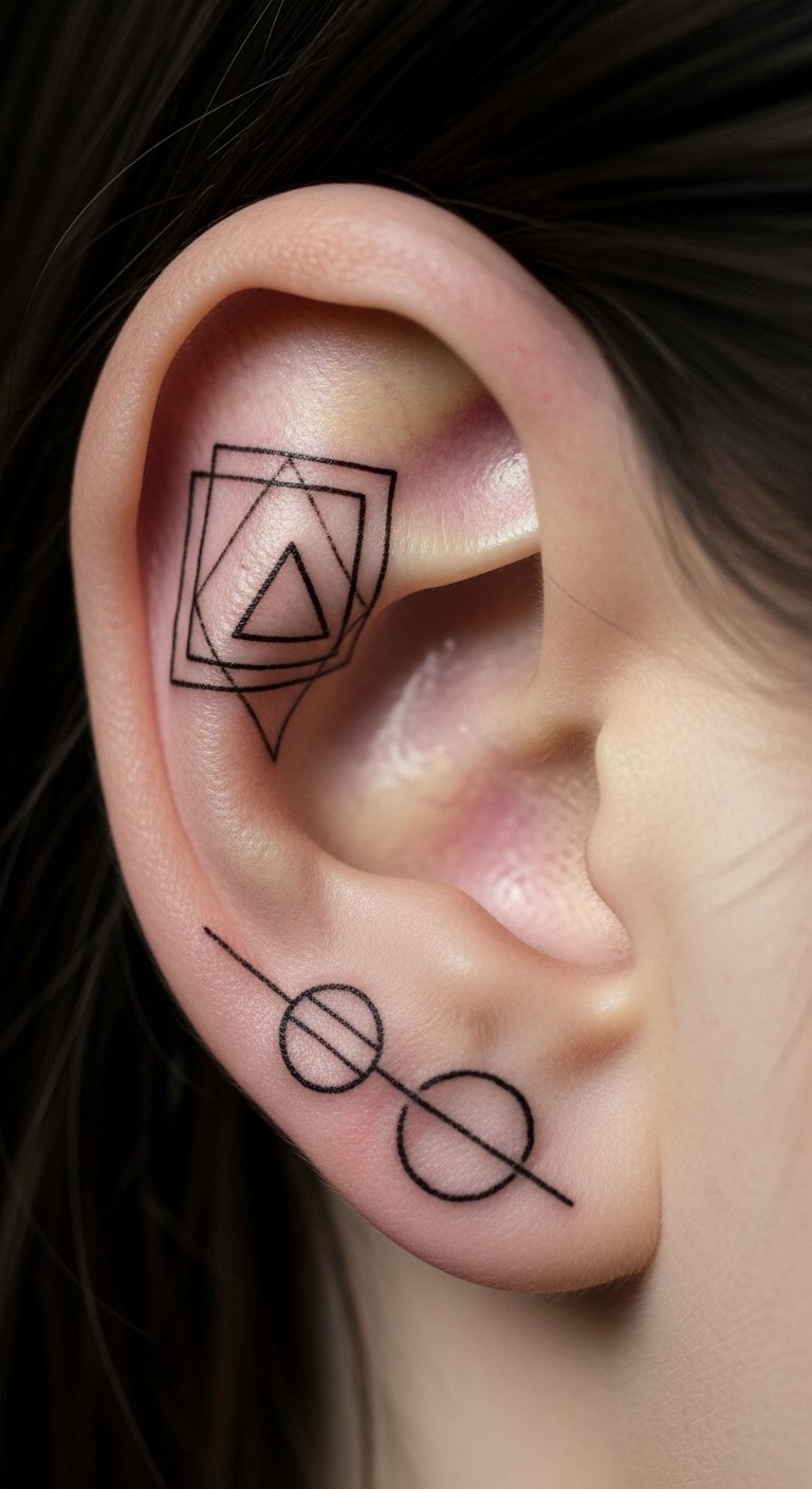 Geometric tattoos on the helix add a modern edge to your ear. Think triangles or circles that fit the curve perfectly. They look sharp and stay discreet under hair. Draw shapes on your ear with a washable pen to test. Grab supplies from a dollar store for less than $2. Pair it with existing piercings for a layered vibe. Artists often price these at $60-80 for the size. Choose shapes that mean something, like a triangle for strength. A DIY step: Use phone apps to overlay designs on selfies. This previews the look for free. Go for a spot that’s visible when you style your hair back.