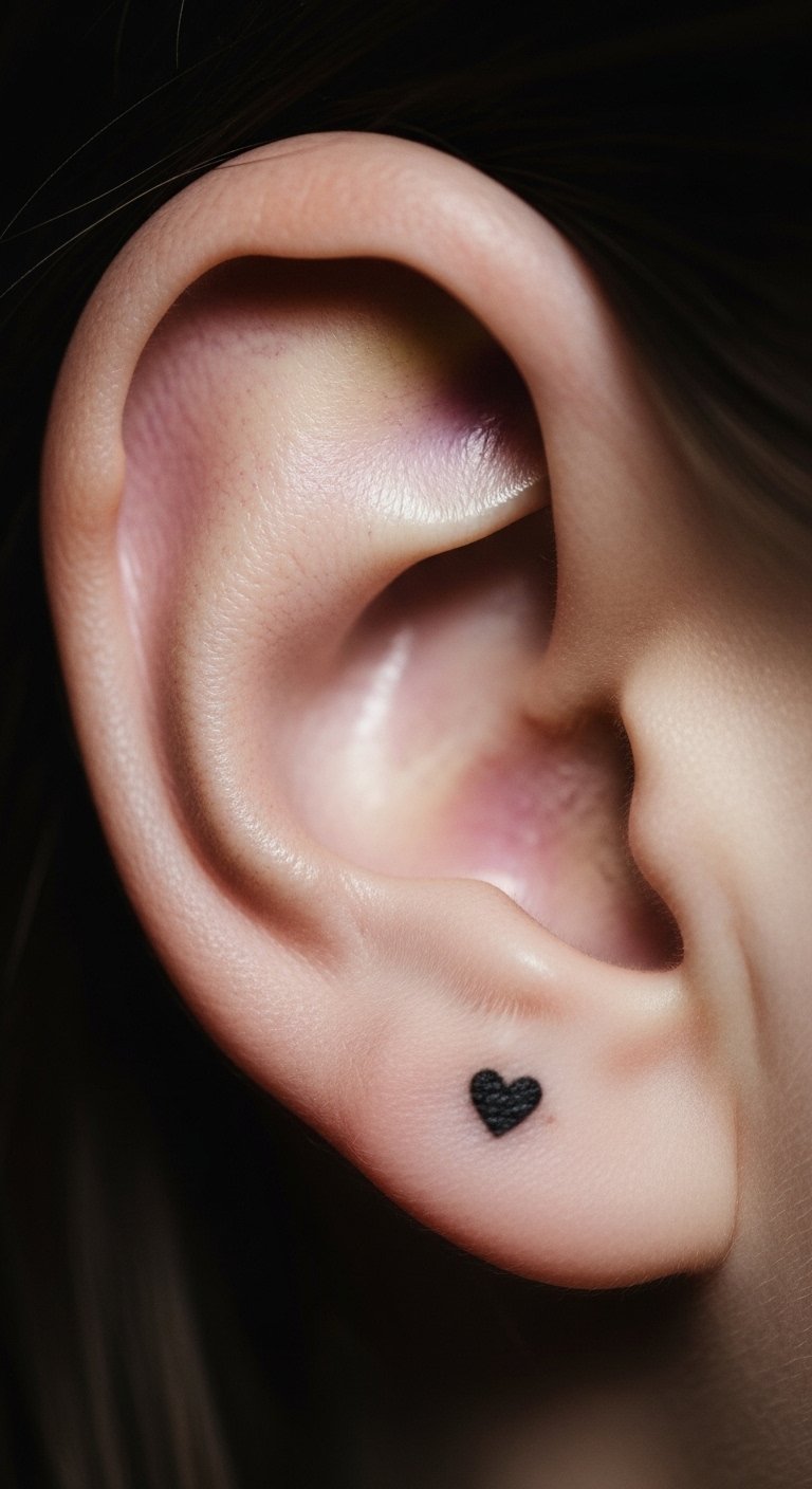 A tiny heart on the earlobe marks big moments in a sweet way. It’s small enough to hide but reminds you of joy every day. Jot down your story and draw a heart sketch at home. Use basic pens for under $1 to practice. This tattoo might cost $40-70 from a nearby shop. Link it to events like a birthday or friendship. Try a DIY mock-up: Stick a temporary tattoo from online packs, starting at $5. Adjust placement based on your daily routine. Keep it meaningful, like a heart for love. This simple step makes the process fun and personal.
