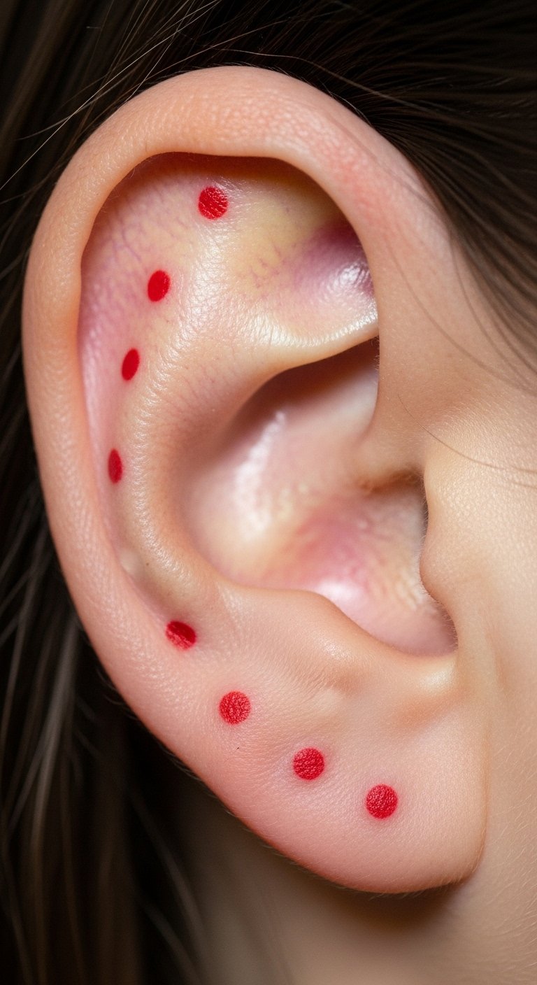 Red ink dots on the ear bring a pop of color to your routine. They’re bold yet tiny, perfect for standing out subtly. Experiment with red markers at home for free trials. Pick spots like the earlobe for easy visibility. Artists price these at $60-100 due to the color. Link dots to ideas like passion or energy. A DIY tip: Use red nail polish on a band-aid to simulate; it costs pennies. This lets you play with placement before going pro. Make it your own with simple patterns.