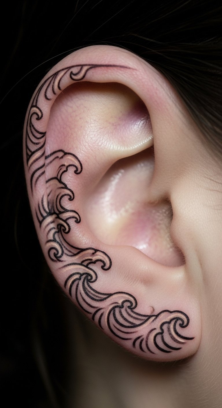 Waves along the earlobe edge give a flowing, natural feel. They’re discreet and add movement to your look. Sketch waves on paper and trace on your ear with a cheap pen. This step is free and quick. Expect $50-80 from an artist for the design. Connect waves to themes like travel or calm. Try a DIY version: Draw with washable ink and wear a hat to test hiding. It helps decide if it’s right for you. Keep it easy and meaningful.