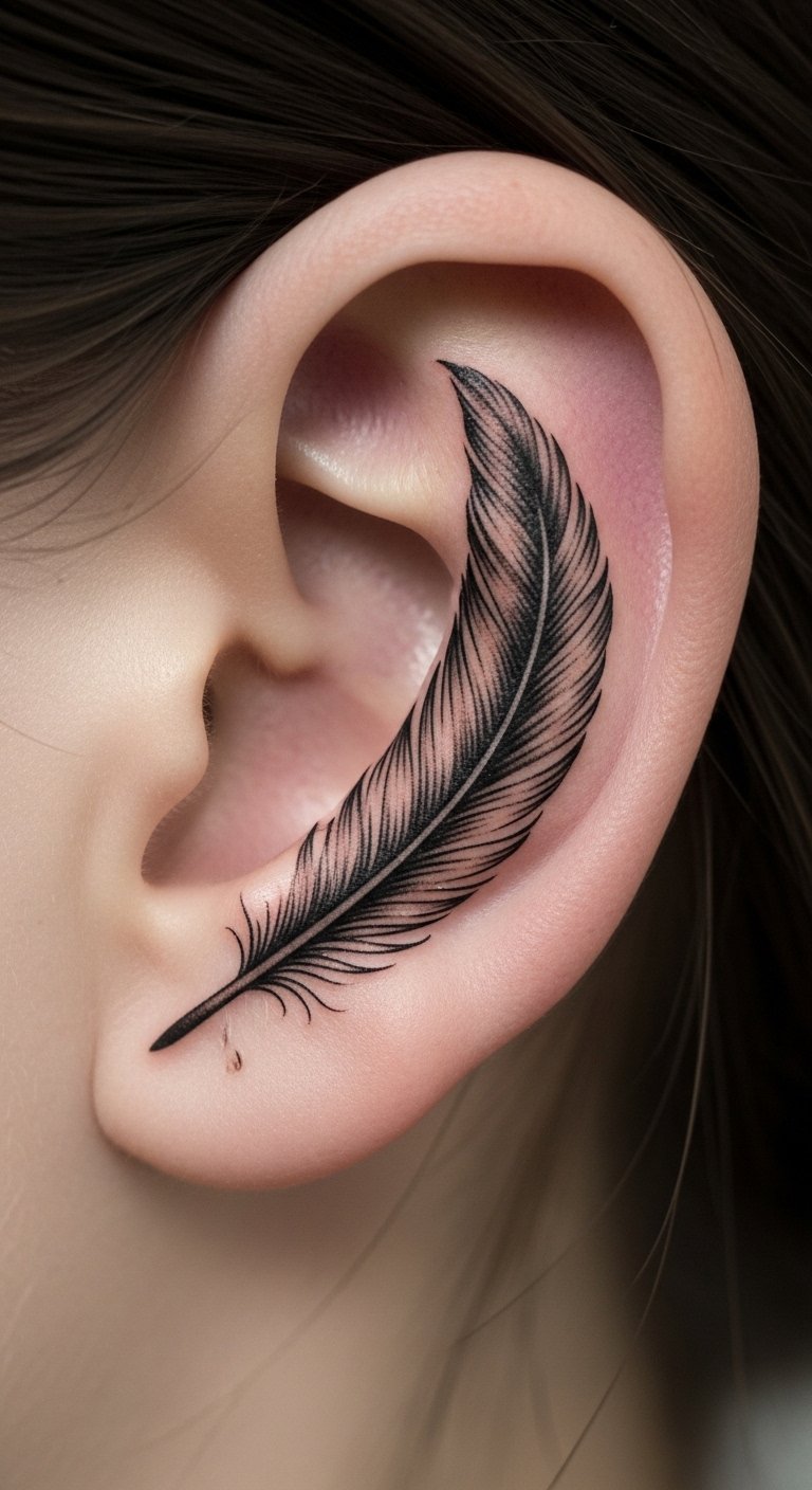 A feather on the cartilage represents freedom in a delicate way. It’s subtle and fits the ear’s shape. Sketch feathers at home with pencils you already have. Artists price at $50-90. Link it to growth or adventure. Test with a drawn version on your skin for free. This helps visualize the final look.
