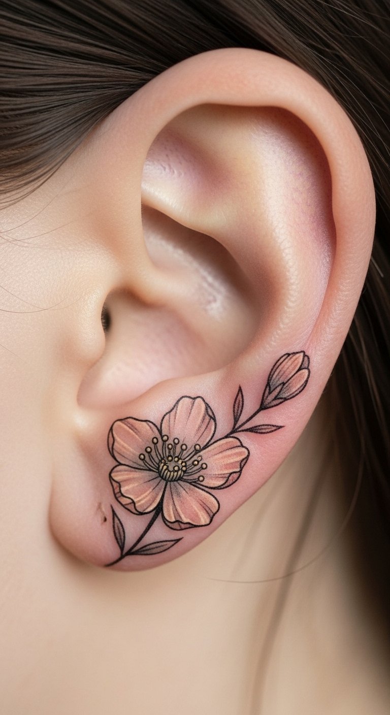 A flower on the earlobe shows growth simply. Draw flowers freehand. Artists charge around $60. Represent new beginnings. Test with temporary designs.