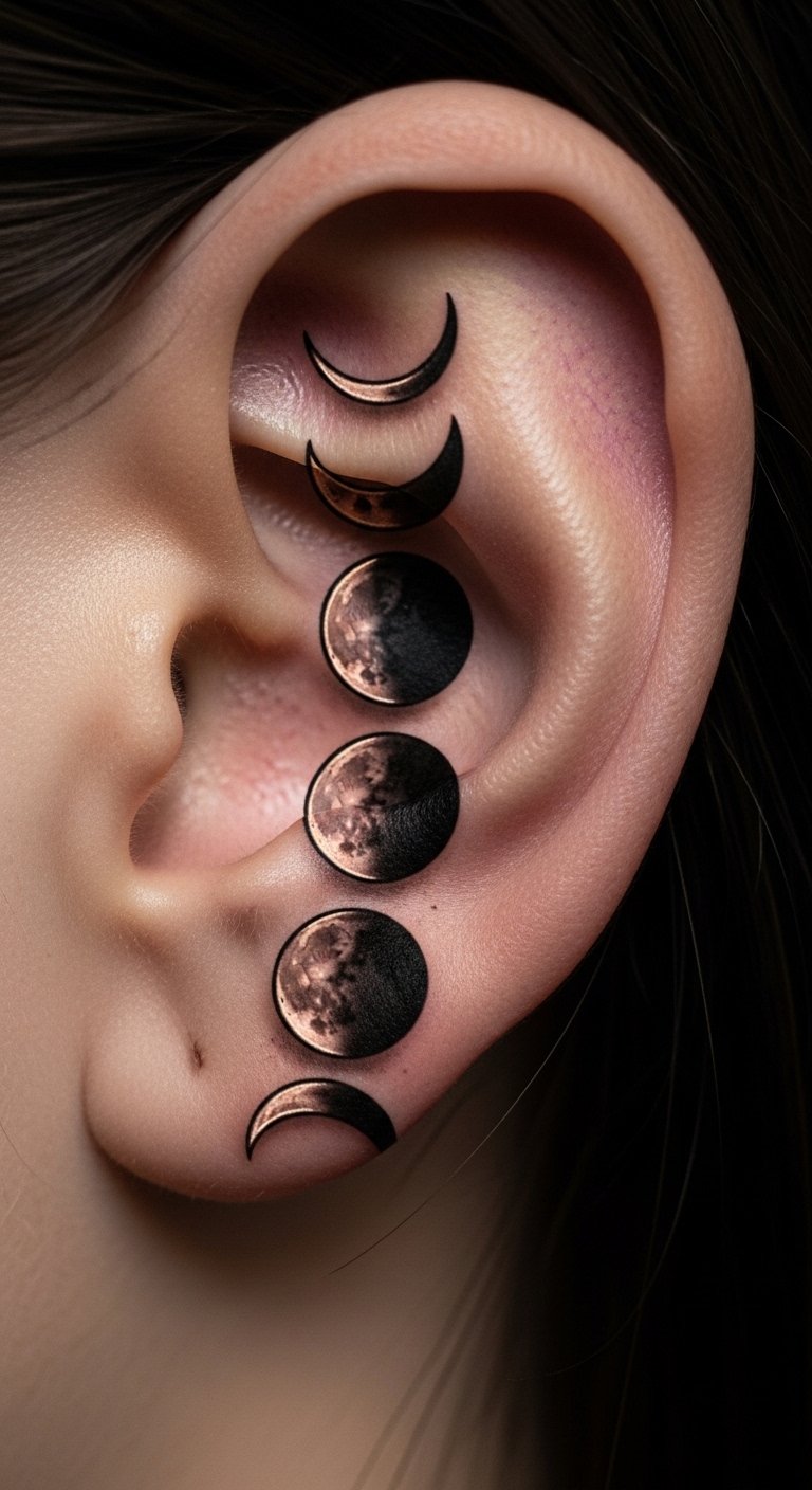 Moon phases behind the ear track time personally. Sketch phases at home. Fees are $40-80. Symbolize cycles. Preview with drawings.