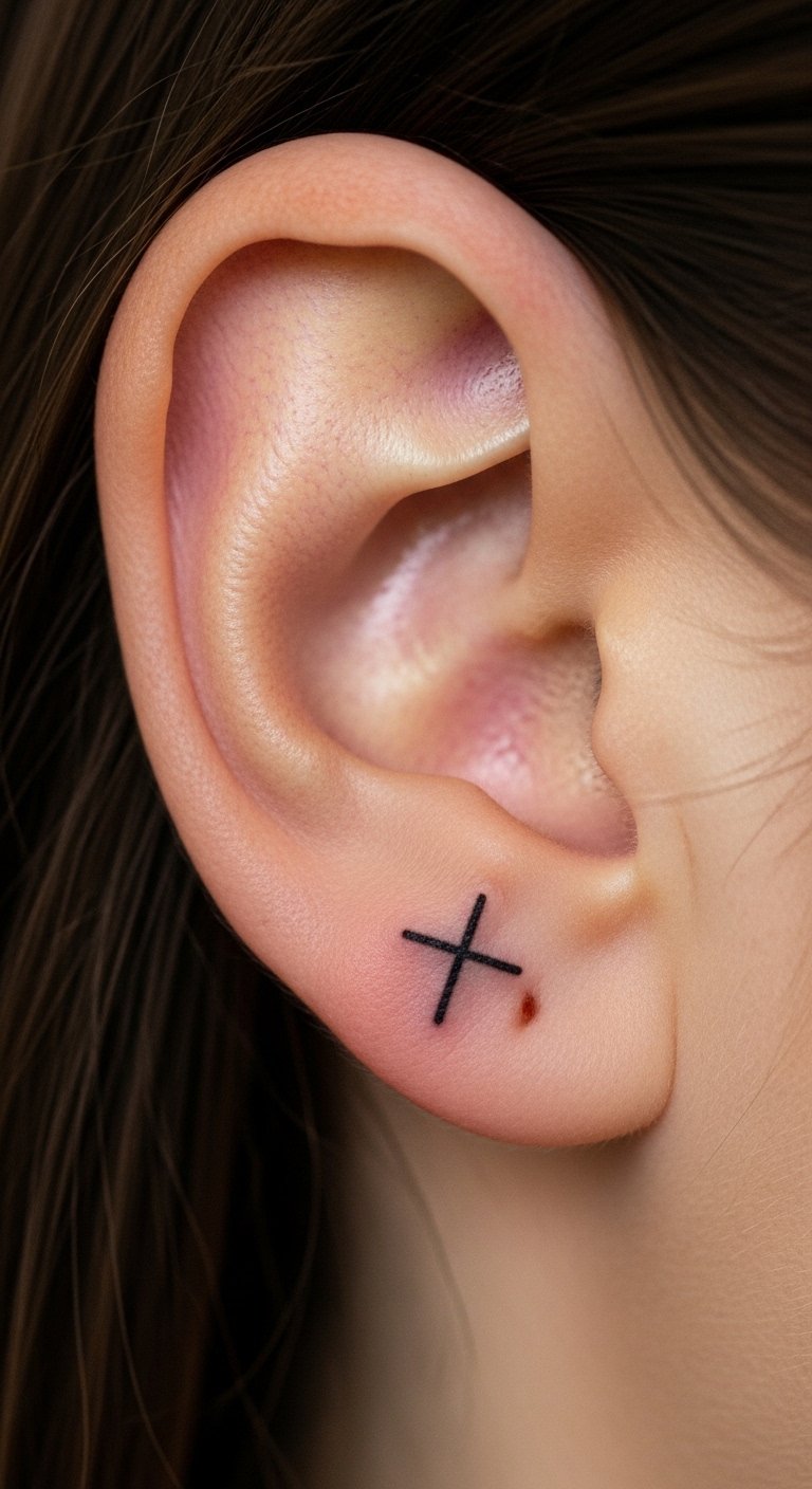 A cross on the lobe adds quiet faith. Sketch crosses fast. Artists charge $30-60. Personalize meaning. Test with markers.