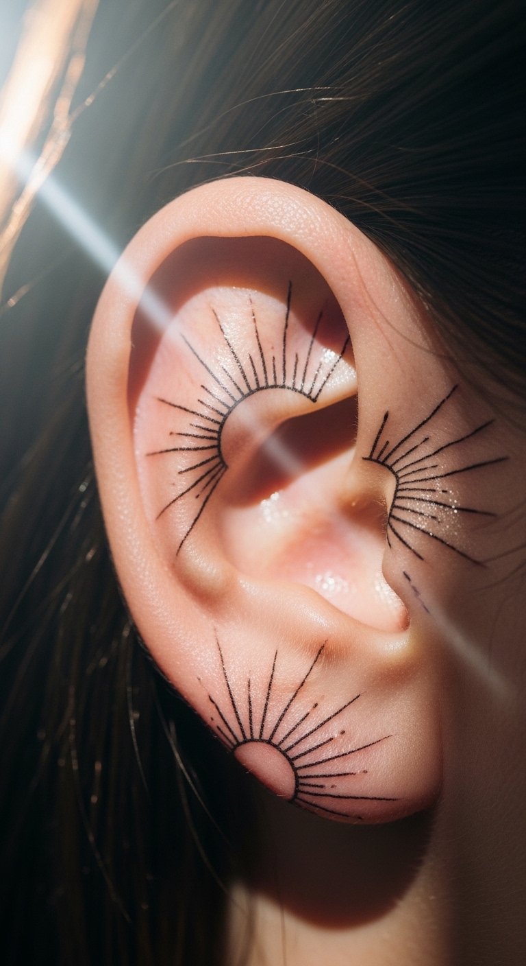 Sun rays on the cartilage brighten your day. Draw rays simply. Artists price at $50-80. Symbolize positivity. Test with drawings.