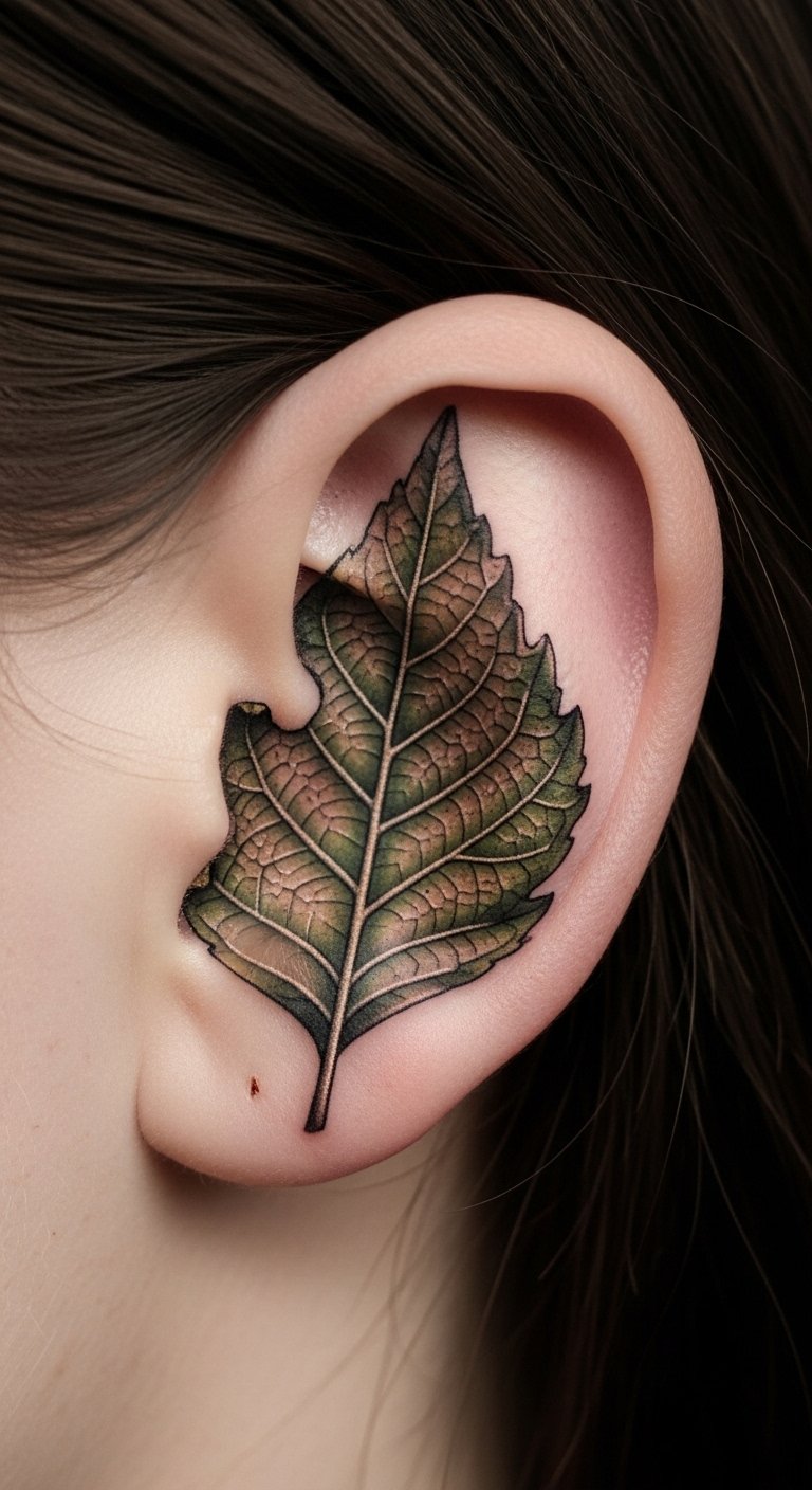 A leaf on the cartilage celebrates nature. Draw leaves simply. Artists price at $50-80. Symbolize renewal. Preview at home.