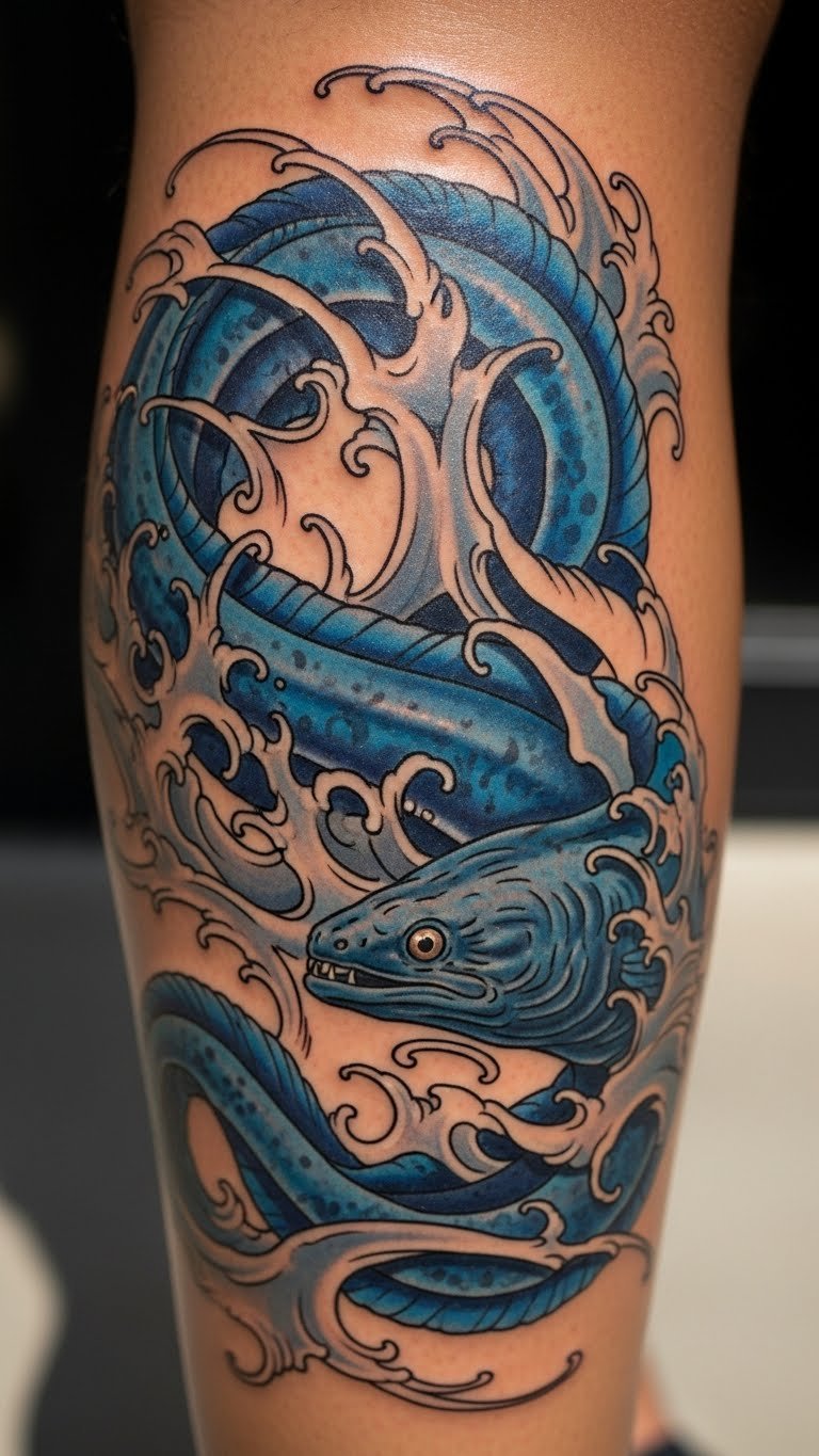 Eels with waves mimic the sea. They show flow and adventure. Sketch waves around the eel simply. Use blue markers for effect. Look for group deals at studios. About $70. Print wave patterns from free sites. Apply with tape on your calf. This design evokes water themes and freedom.
