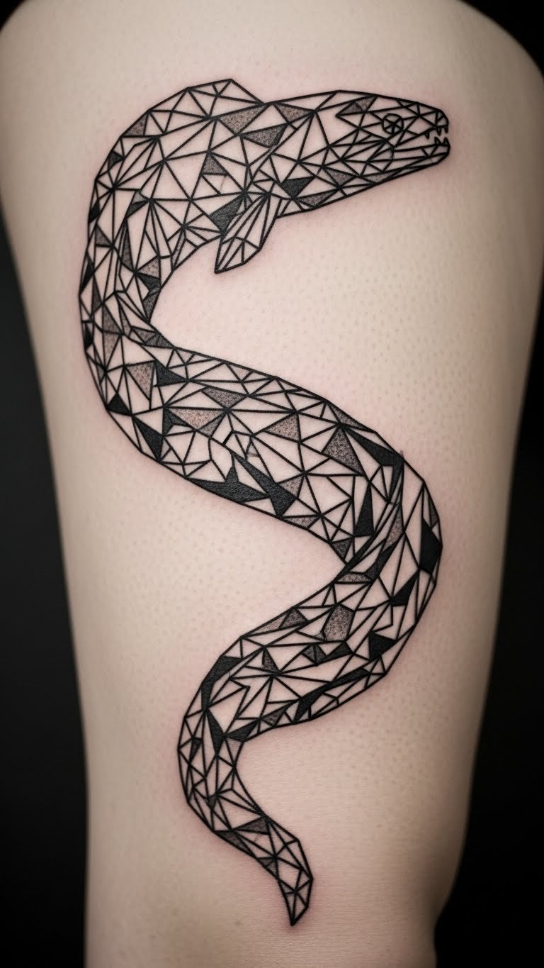 Geometric eels play with angles. Sketch triangles along the body. Start with graph paper. Find sales for $90. Use geometric rulers for accuracy. Put it on your thigh for art. This design adds modern edge.
