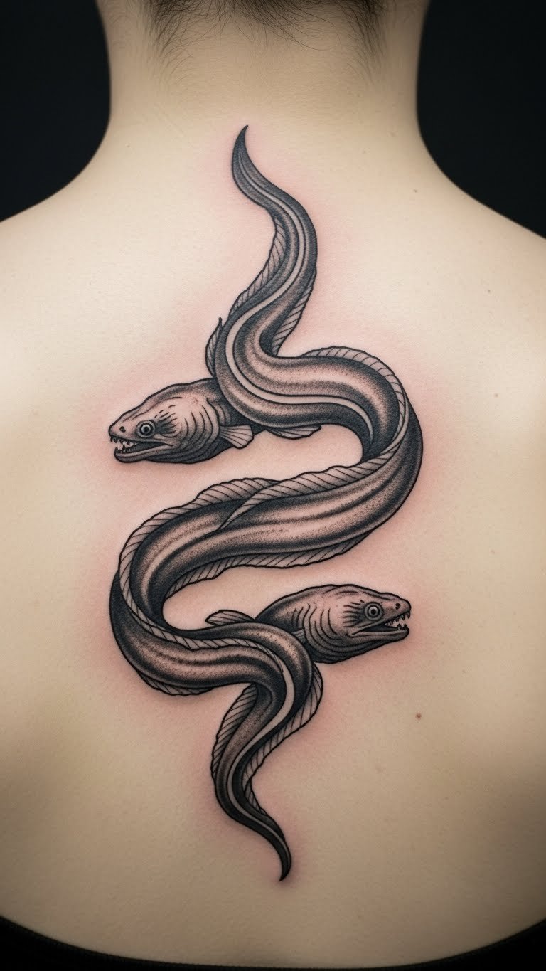 Double eels create perfect symmetry. Draw mirrors on paper. Find $100 options. Use folding paper for symmetry checks. Place on your back for impact. This design highlights duality and poise.