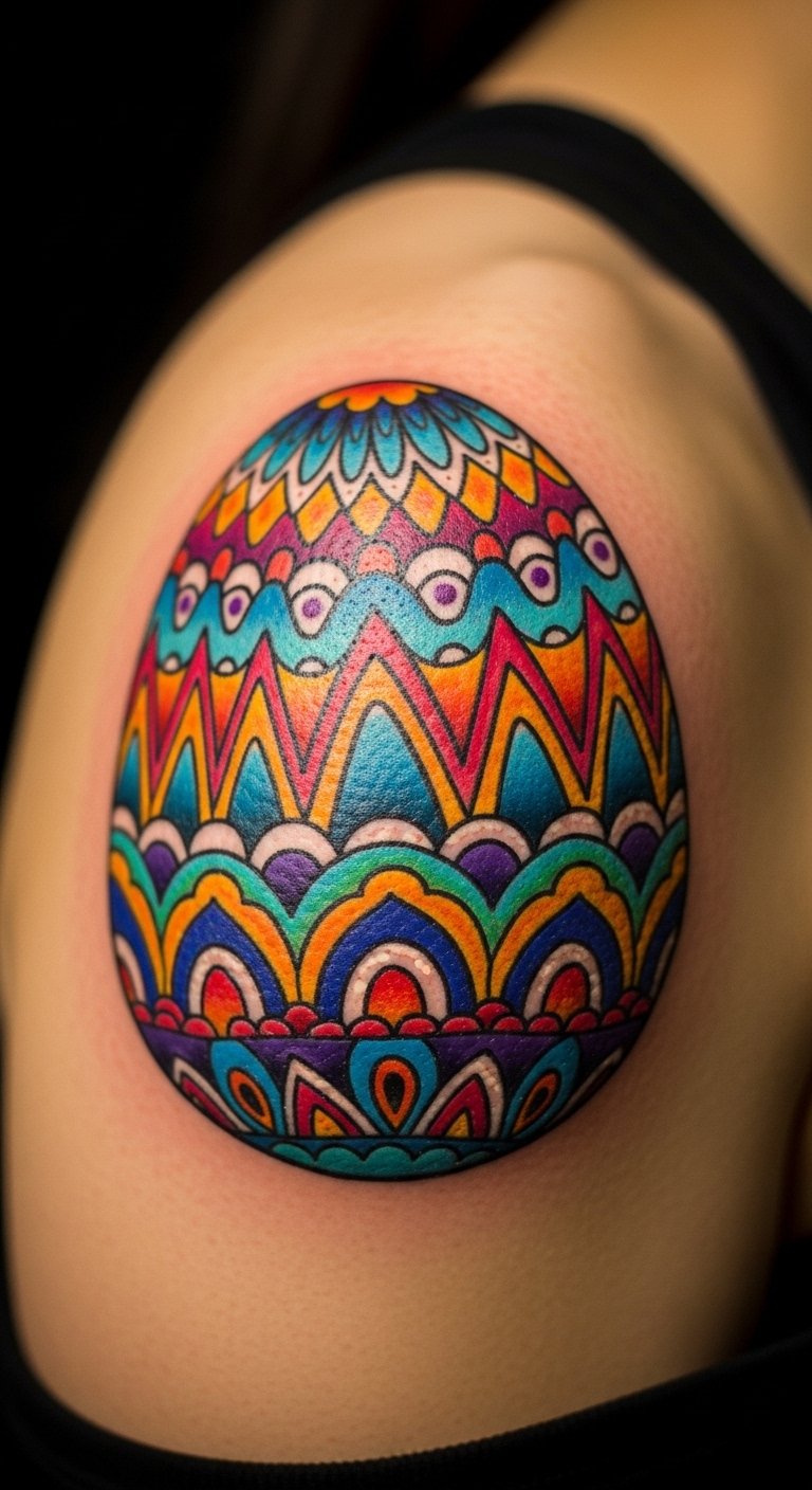 Go big with bright colors on your arm. Picture an egg exploding in reds and yellows. Grab colored pencils and draw it on your skin first. It’s free and fun to experiment. Choose affordable ink shops that offer package deals. Place it where you can show it off, like your ankle. For a DIY twist, use temporary tattoos to preview. Keep sizes modest to save money. Mix in simple patterns like stripes for extra flair. This idea works for events and adds energy to your day.