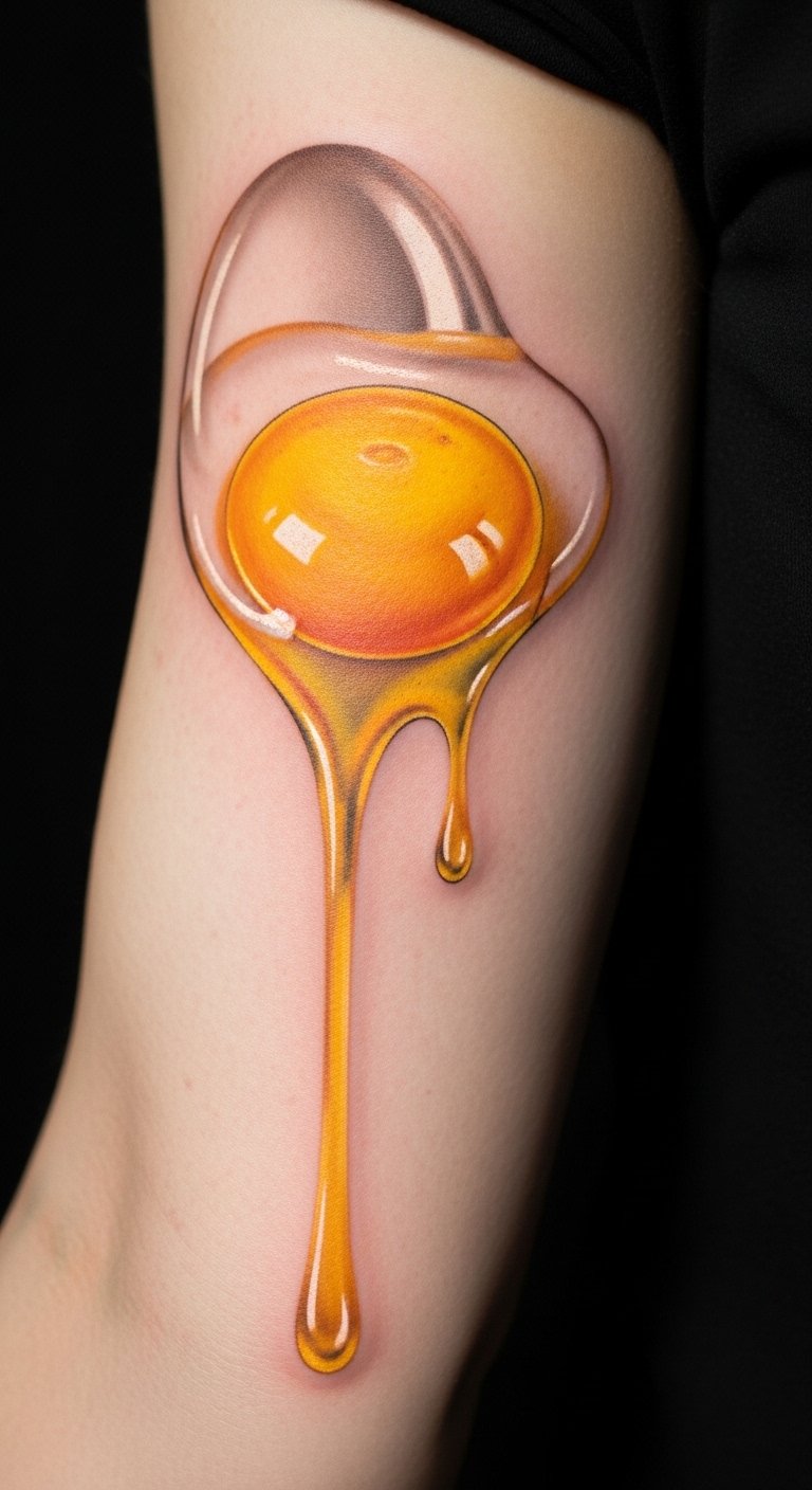 Go for real yolk drips down the egg. It’s striking. Practice with paint at home. No charge. Watch for sales at shops. Place it on your arm for display. Use makeup for a temporary version. Choose smaller drips to cut costs. Add shine for realism. This adds drama to your look.