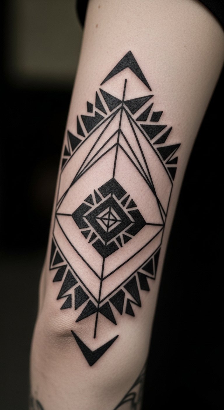 Geometric tattoos offer clean, adaptable shapes for your elbow. They highlight strength through angles. Pick small designs to stay budget-friendly, around $120. Try drawing triangles on your skin with a pen for a DIY preview. This helps see the fit. Use bold, high-contrast lines for visibility. Heal faster by avoiding tight clothes. Pair it with simple aftercare like gentle washing. It’s perfect for beginners seeking something modern. Find an artist with similar work online. This pattern makes a strong, understated statement every day.