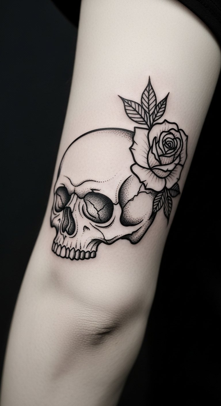Mix a skull with a rose for contrast on your elbow. It blends power and beauty seamlessly. Go for basic ink to stay under $170. Draw the combo on your skin with a marker for DIY practice. Adjust for the best fit. Use clear lines to make it stand out. Heal with over-the-counter creams. This design pairs well with casual attire. Seek artists who’ve done similar mixes. It’s a straightforward way to show depth.