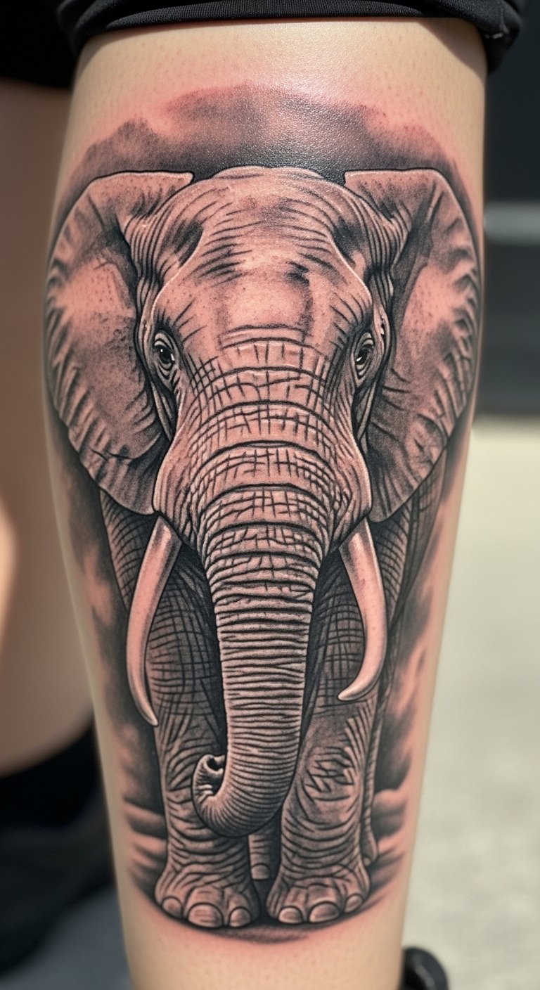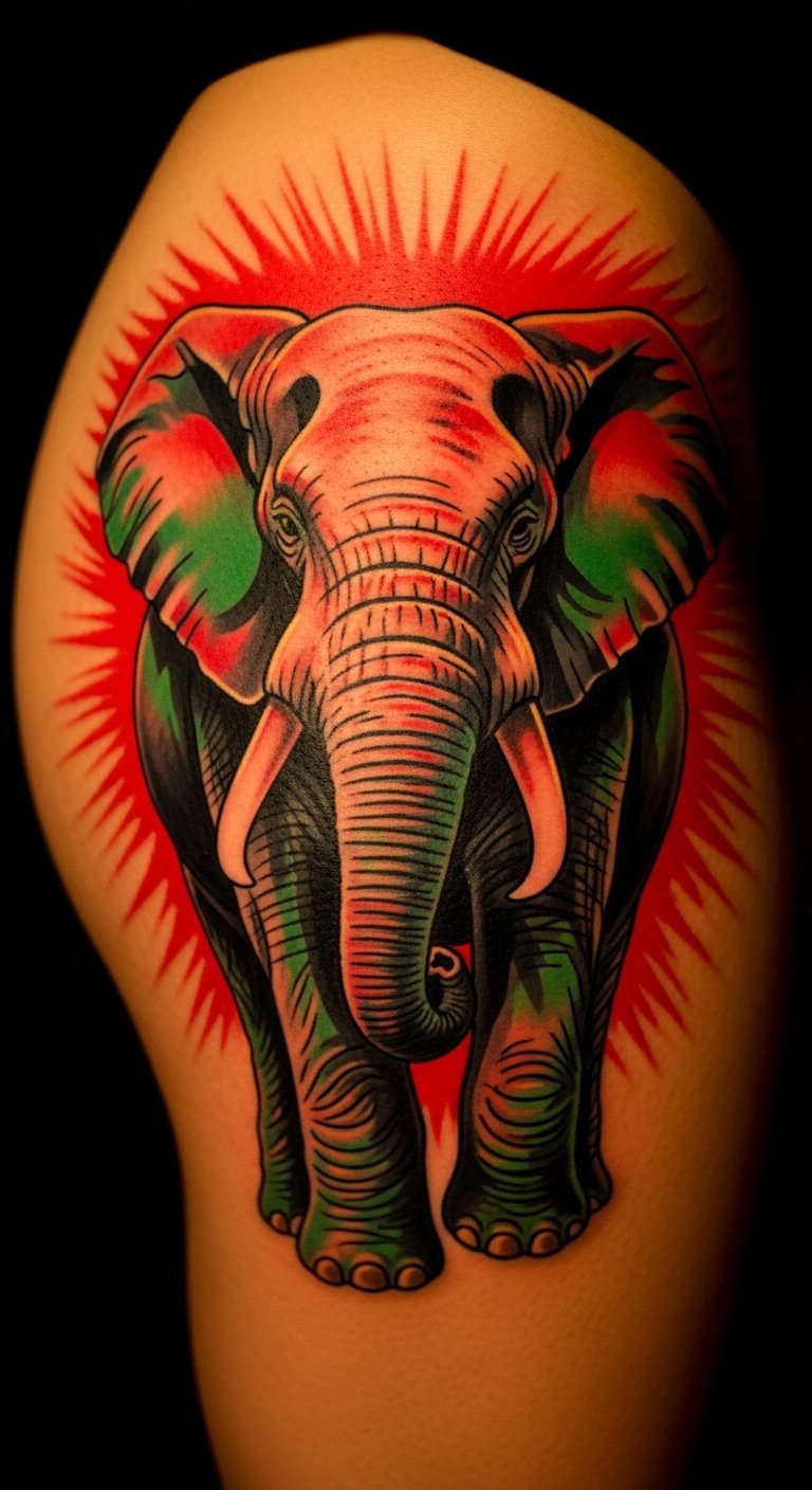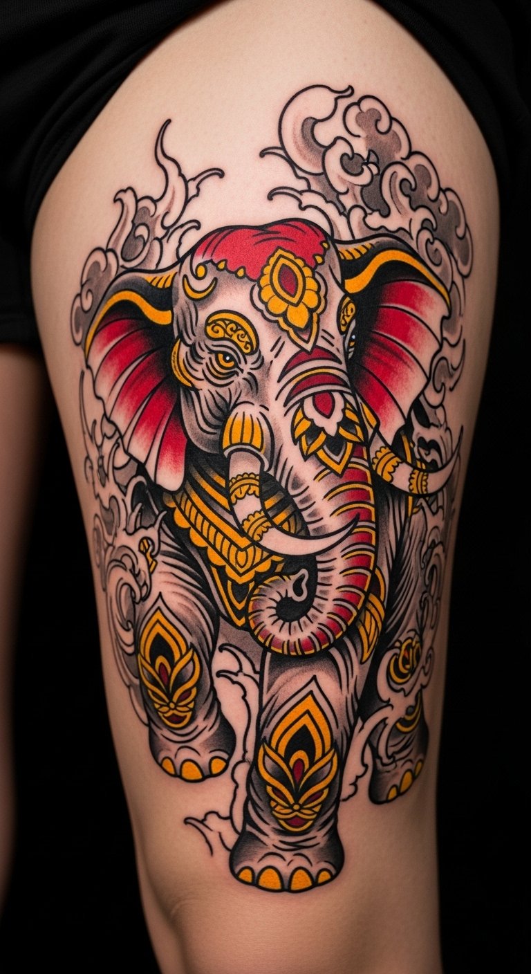 Go bold with neo-traditional styles on your thigh. This look features thick lines and bright hues for a lively feel. Sketch rough ideas at home with colored pencils. It’s a simple DIY to visualize the pop. Save money by choosing local studios with package deals, around 3-5 million VND for medium sizes. Position it for easy cover with clothes if needed. Add tribal patterns to amp up the cultural nod. This tattoo highlights loyalty and power. Break the design into parts for shorter sessions. Practice drawing elements like the trunk to guide your artist. It’s practical for first-timers. Wear loose pants post-tattoo to aid healing. This method keeps things affordable and personal.