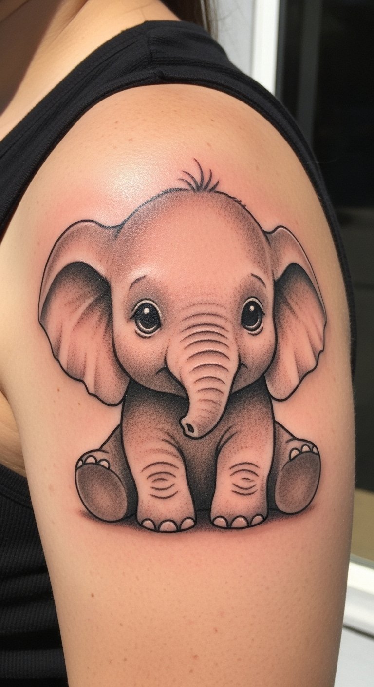 Baby elephants bring a cute, innocent charm to your shoulder. They represent family ties in a sweet way. Try doodling chubby shapes on paper as a DIY start. It helps refine what you like. For low costs, pick small designs at 500,000-1 million VND. Place it where it shows in casual tees for fun. Mix in playful details like big eyes for emotional depth. This style focuses on joy and bonds. Sessions are quick, often 30 minutes. Use home sketches to discuss with your artist. Keep it simple to avoid extra fees. Test the area with stickers first. It’s an easy, budget-friendly choice for meaningful ink.