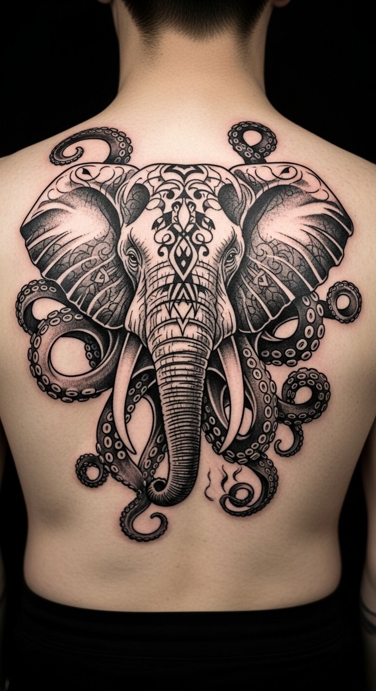 Mix things up with an elephant octopus hybrid on your back. It’s a surreal blend for creativity lovers. Draw fusion ideas at home using basic art supplies. This DIY makes planning fun. Look for affordable artists charging by the hour, around 4 million VND. Spot it centrally for balance. Add waves or patterns for more flair. This design stands for adaptability and dreams. Divide the tattoo into phases if it’s large. Sketch prototypes to share ideas. It keeps costs down. Wear breathable shirts for comfort after. This approach turns imagination into affordable art.