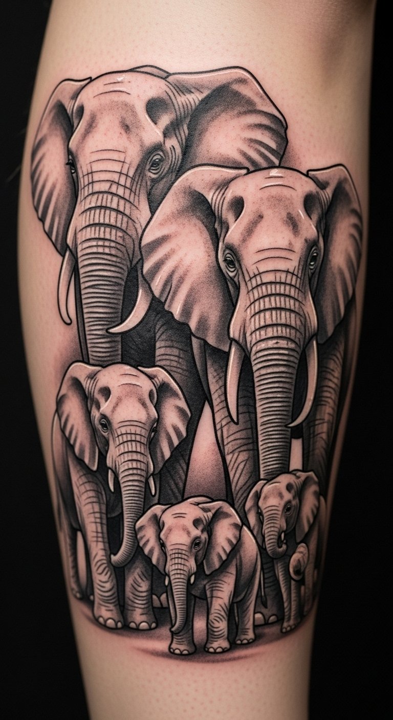 Family-themed elephants on your leg celebrate connections. Use group motifs for warmth. Sketch family groups at home. This DIY builds the concept. Budget for group elements at 3 million VND. Place along the leg for flow. Add hearts for emphasis. This tattoo honors bonds. Break into parts for ease. Share sketches to guide. It’s affordable and heartfelt. Test with family input.